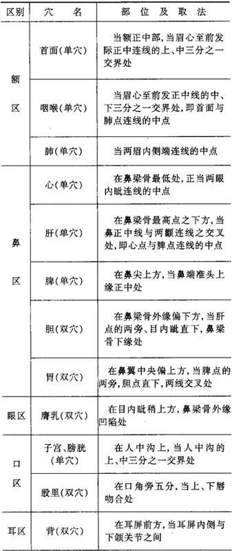 是针刺面穴以治疗疾病的方法。 面部和经络联系密切,“十二经脉,三百六十五络,其血气皆上于面而走空窍”(《灵枢·邪气藏腑病形》)。《灵枢·五色》明确指出,在颜面,“五藏六府肢节三部也,各有部分”,并具体记载了相应部位的划分,并以其色泽变化的情况,“各以其色言其病”。 解放后,广大医务工作者据此进行临床实践,创造了面针疗法。不仅用于治疗疾病,还可以进行针刺麻醉。 临床操作时,根据病变处所选取相应穴位,视其肌肤厚薄分别采用直刺、斜刺或横刺角度进针,得气后留针15~30分钟,其间可运针数次,亦可加用电针等刺激或以皮内针埋藏。唯面部感觉敏锐,刺激不宜过强;如有疤痕破溃处,应予避开。本法适应范围较广,凡针刺疗法适应症均可使用,对神经衰弱、高血压、痹症、哮喘等效果尤佳。 面针疗法穴位表