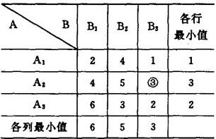 在矩阵对策中,当一方采取不同策略至少赢得数值中最大的数与另一方采取不同策略至多可能输掉数字中最小的一个相等,则这个数值为这一矩阵的鞍点。 例如:有A、B二人对阵,双方各有三种策略,则支付矩阵可表示:  当A方分别选择策略A1、A2、A。时,考虑到B将采取相应对策,使其赢得少些,因此,A至少赢得的数值是各行最小的。 当B分别选择策略B1、B2、B3时,考虑到A将采取相应对策,使其失去的多些。因此B至多失去的数值是各列中最大的。 A要赢得多些应选择各行最小数字中最大的一个数相对应的策略,在本矩阵中A方最小赢得数中最大的一个是3。B方要尽量输得少些应选择各列最大数字中最小的一个数相对应的策略,在本矩阵中B方最大输掉数中最小的一个也是3,则A方采取第二策略与B方采取的第三策略相对应的一点3为这个矩阵的鞍点。 |