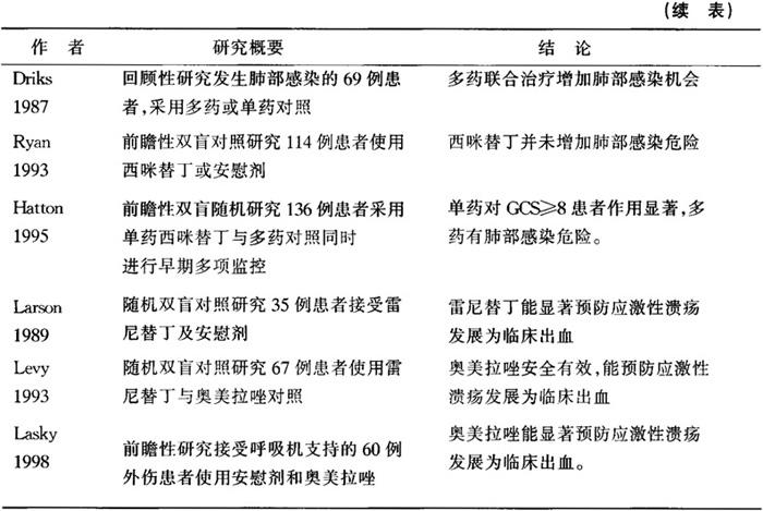 简介 1.结论 对颅脑创伤患者,主张早期进行应激性溃疡的预防性治疗,可考虑使用H2受体拮抗剂及质子泵抑制剂。对颅脑创伤已并发应激性溃疡的患者,应从两方面著手:一是积极治疗原发性创伤;二是进行胃肠道保护治疗,两者必须同时进行。 2.方法选择 对颅脑创伤后容易出现应激性溃疡患者,可以考虑进行早期预防性治疗,已知H2受体拮抗剂及质子泵抑制剂有效。而对于已并发应激性溃疡的患者,在积极治疗创伤的同时,可针对胃肠采用西咪替丁等H2受体拮抗剂来抑制或减少胃泌素、胃酸的分泌,或可使用质子泵抑制剂,同时可考虑使用胆碱受体阻断剂,不仅有抑酸作用而且还有改变胃肠血循环的作用,有利于组织细胞的存活。 一、概述 颅脑创伤后并发应激性溃疡,亦称Cushing溃疡,1932年由Cushing首先发现而得名,该并发症与脑损伤的严重程度密切相关。据相关资料报道,颅脑创伤后应激性上消化道病变的发生率可高达91%,其出血发生率为16%~47%,出血后死亡率可高达50%。因此临床上把创伤后并发应激性溃疡视为重度颅脑创伤的标志。 颅脑创伤并发应激性溃疡,目前认为其发病机制主要有: 应激性溃疡病理改变表现为圆形红色糜烂,直径3~5 mm,或黏膜下出血。严重时造成胃肠大量出血,引起出血时休克,致使机体血容量不足,颅内灌注压因而低下,既加重了原发性损伤,又造成继发性损害,与原发损伤形成恶性循环。此时应激性溃疡的处理变得更为棘手,其预后差,临床死亡率高。因此,在治疗过程中,首先主张早期进行预防性治疗。对于已确诊患者积极治疗原发损伤,同时进行胃肠保护治疗,两者必须同时进行。预防及治疗均可选用H2受体拮抗剂、胆碱受体阻断剂、质子泵抑制剂。但有资料认为采用上述治疗可引起肺炎发病率增高46.2%。颅脑创伤患者出现应激性溃疡的危险因素包括GCS<8分、出现SIADH、创伤后神经功能减退、年龄≥60岁、有溃疡史患者、高血压患者、中枢神经系统感染、长时间呼吸机支持(>48h)及败血症。已有8篇严格设计的预防及治疗应激性溃疡方面的研究,均支持早期应用H2受体抗剂及质子泵抑制剂来预防应激性溃疡。 二、论点形成过程 通过MEDLINE检索,输入关键词为“应激性溃疡”及“颅脑创伤”,发现文献63篇,同时查阅20年来《中华神经外科杂志》、《中华创伤杂志》、《中华神经精神病学杂志》、《国外医学·神经外科分册》等文献58篇,对所有脑外伤后严重应激性溃疡的有关资料均进行了复习。 三、科学基础 美国在1999年由Lan组织了一次对全国临床医师治疗应激性溃疡的问卷调查,返回的问卷中328份有统计学意义。其中最常用于应激性溃疡的药物是H2受体拮抗剂(67%),其中西咪替丁占12%,雷尼替丁占31%,法莫替丁占24%。在1984年,Chan报道了一组381例颅脑外伤患者的前瞻性研究,其中间断使用西咪替丁(800mg/24h)的2.4%患者在用后5d仍然出现胃肠出血等临床症状。而早在1984年,Zach等对84例急性脊髓损伤患者进行前瞻性随机双盲对照研究,间断使用西咪替丁(1.2~2.4g/24h)亦不理想,而对26例患者予以高剂量的西咪替丁(300mg,静注,每4h一次)时,则能成功控制胃内pH值,同时有效控制临床出血。在一个回顾性研究中,Driks报道了一组发生肺部感染的69例患者,认为多药治疗能增加肺部感染的概率(46.2%),而单药抗酸治疗为23.1%。用H2受体拮抗剂为5.9%。但此研究病例数少,有待进一步明确。而在1993年时,Ryan等对114名应激性溃疡患者进行前瞻性双盲对照研究,认为西咪替丁并未增加肺部感染的发生率。Hatton等对收住神经外科ICU病房的136例患者进行前瞻性双盲研究发现,GCS≥8分的患者采用西咪替丁进行预防有效。GCS<8分患者胃内pH值低的可能性大,单用西咪替丁效果不理想,仅35%有效,与82例GCS≥8分的患者相比较P<0.001。而采用多药治疗对有出血危险的患者作用有限,且能增加肺部感染的发病率(14/32),因而不受支持,他们主张早期常规进行临床监控,进行预防性治疗。 在一个对神经外科ICU患者进行的随机双盲对照研究中,Larson等发现以6.25mg/h的剂量注入雷尼替丁可以提高胃内pH值2个单位(胃内平均pH值为4.17),同安慰剂相比有统计学意义。接受雷尼替丁患者均未发展为临床出血,因此他们认为雷尼替丁对应激性溃疡有重要的预防性治疗作用。1993年,Levy等对67例患者进行随机双盲对照研究,35例予以雷尼替丁150mg/d,32例予以奥美拉唑40mg/d,其中雷尼替丁组患者35%发展为临床出血,而后者仅为6%(P<0.05);而肺部感染前者和后者分别为14%和3%(P>0.05)。故而认为奥美拉唑安全有效,并能显著预防临床出血,但其病例数亦有限。1998年Las个对外伤后接受呼吸机支持并发应激性溃疡的60例患者进行前瞻性研究,认为奥美拉唑预防临床出血作用显著(未发现临床出血患者),能有效控制胃内pH值,且安全无毒性,但其病例数亦少。因此,大多数研究表明,采用H2受体拮抗剂和质子泵抑制剂能预防应激性溃疡并减少临床出血,主张早期预防,但其肺部感染危险尚待进一步明确。 四、小结 大多数临床研究报道主张采用H2受体拮抗剂及质子泵抑制剂来早期预防颅脑创伤后应激性溃疡的发生,认为早期常规使用对患者的预后较好。如果应激性溃疡已经发生,可以考虑在治疗原发创伤的同时进行胃肠道保护治疗。但考虑到肺部感染的危险,不主张联合用药。因此可考虑选用单药大剂量早期进行预防性治疗高危患者。 五、前景