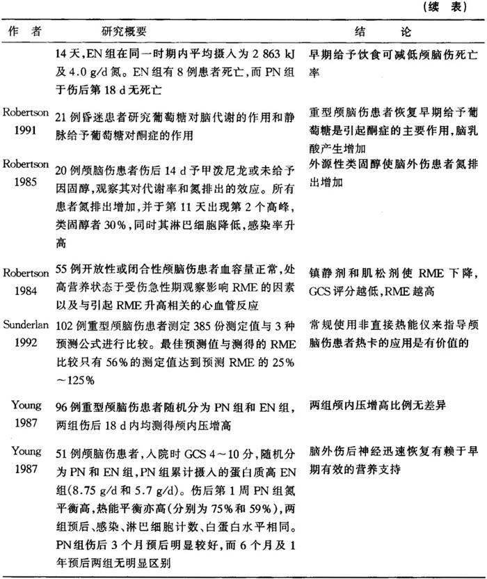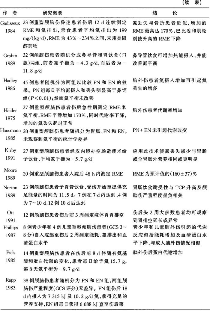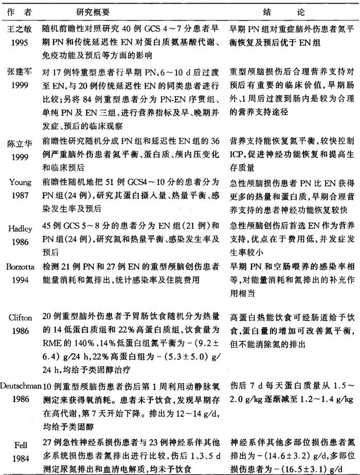 简介 1.结论 早期积极合理的营养支持不仅能够增加颅脑创伤患者的能量和氮摄入量,促进蛋白质合成,恢复氮平衡,而且可以降低感染率,促进神经功能恢复,降低死亡率和致残率,提高生存质量。 2.方法选择 营养支持有经胃肠外营养(PN)、胃肠内营养(EN)和经口三种。PN可选用周围静脉置管或中心静脉置管,以后者常用,包括锁骨下静脉和颈内静脉。EN包括鼻-胃管饲,鼻-十二指肠或鼻-空肠管饲、胃或空肠造瘘术及空肠导管穿刺术等,如短期使用,以鼻饲法最常用;如需长期营养支持(4周以上),以胃或空肠造瘘为首选;最好采用输液泵24h连续灌注恒速饲食。 3.时机 倾向早期建立营养支持通道。早期胃肠外营养多在伤后48h内开始,在胃肠道功能有所恢复时应及早从PN过渡到EN。早期经空肠行营养支持在受伤后36~72h开始进行。轻型颅脑创伤患者解除禁食后即可经口进食。 4.原则 高热量、高蛋白而不升高血糖。 一、概述 (一)颅脑创伤患者进行营养支持的基本原理 颅脑创伤特别是重度脑外伤的患者,机体处于高分解状态,全身代谢平衡严重紊乱,表现为: (二)PN与EN的利弊 国内外有关脑创伤后营养支持途径的争论集中在PN与EN的应用时机上。提倡早期PN的研究认为,伤后1~2d由于儿茶酚胺诱导糖原异生和肝糖原释放以及下丘脑受创伤影响,此时机体不能吸收外界营养物质,因此把营养支持安排在伤后48h进行符合临床病理机制;由于颅脑创伤早期有颅高压存在及下丘脑自主神经功能紊乱,常有呕吐和胃排空延迟等胃肠功能抑制现象,此时如给予胃肠营养不但营养不能吸收,反易因呕吐、反流造成误吸,诱发肺部感染,增加机体负担,因而此期给予PN是合适的。提倡早期EN的研究者认为,早期经空肠营养支持而不是传统的经鼻胃营养支持可以避免呕吐、反流等情况,从而消除伤后因胃排空延迟引起患者对EN的耐受性降低,早期经空肠营养对能量消耗和氮排出的补充作用与PN相当,感染发生率也相同,而PN时患者的住院费用却明显高于EN。由于长期使用PN的危重患者可出现肠源性饥饿综合征,表现为肠蠕动减慢,肠黏膜细胞减少,黏膜萎缩,肠腔内分泌型IgA明显减少,而肠道营养有利于维持肠黏膜细胞结构和功能的完整性,减少肠源性感染的发生。因此,在情况允许下应及早从PN过渡到EN。 (三)热能与氮需要量的计算 颅脑创伤患者热能需要量计算:每天热能需要总量(kJ)=基础能量消耗(BEE)×静息代谢消耗百分比系数(%RME);用Harris-Benedict公式计算BEE:男性BEE=4.18×[5.48×身高(cm)+11.51×体重(cm)-3.74×年龄(岁)-189],女性BEE=4.18×[2.95×身高(cm)+8.73×体重(kg)-1.94×年龄(岁)+252];用Clifton营养公式计算%RME:GCS≤7者%RME=152-14×GCS+0.4×心率+7×伤后天数;GCS≥8者%RME=90-3×GCS+0.9×心率。 颅脑创伤患者氮需要量可根据氮平衡公式计算:氮平衡(g/d)=蛋白质摄入量(g)÷6.25-(24h尿氮量+4g);实际上即使补充大量蛋白质和能量,颅脑创伤后近2周内也很难达到正氮平衡,但最好使氮平衡≥-10g/d。 (四)营养液的要求 PN最佳氮源是L-氨基酸溶液,应包括必需氨基酸和非必需氨基酸,两者比例约为1∶2。应激状态下可选用支链氨基酸。PN中最佳的非蛋白质能量来源应是葡萄糖和脂肪组成的双能源,两者的比例约为4∶6或5∶5,必要时加入适量外源性胰岛素。一般非蛋白质热量与氮之比为100~150∶1。维生素、微量元素应根据病情变化的需要给予全面、足量补充。 EN配方应根据患者代谢和营养状况、胃肠道功能及对水摄入的限制来选择。热能浓度多为6.27kJ/ml,蛋白质含量为25~83g/L,其热量分配为8%~22%,糖类含量38%~80%,根据需要可选择高脂肪(18%~68%)或低脂肪(0.2%~2%)。国外有专门配制的标准胃肠道营养液,每升含蛋白质42g、脂肪10.8g、糖类185g,并富含维生素和无机盐。胃肠道功能完全的患者可用聚合物膳食,一般由牛奶、鸡蛋、豆浆等配制,还可加入食盐和水,一般医院都能自行配制。混合奶配方:牛奶800ml,水150ml,葡萄糖200g,蛋黄100g,氯化钠5g,氯化钾2g,乳酸钙1g,酵母10g,维生素B1100mg,维生素C500mg,鱼肝油少许。除此之外,临床已多采用市售胃肠内营养制品,这些产品采用科学配方,营养成分较高,热量高,使用方便,尤其适合鼻饲法补充营养。还有专门针对高血糖的营养制品。如肠的同化作用不全,则采用要素饮食。国产营养支持用要素饮食每100g粉剂中含葡萄糖71.8g、氨基酸18.8g,脂肪4.4g及各种维生素、微量元素。 (五)药物调控 现代观点认为,随著脑创伤患者营养支持的不断完善,对代谢反应的某些方面应用药物进行调控,如利用生物工程技术生产的重组人生长激素、胰岛素样生长因子Ⅰ等,在促进氮平衡、提高血浆蛋白水平、增强免疫及其他营养成分的补充上具有积极的作用和意义。 二、论点形成过程 输入英文主题词“head injury”和“nutrition”,检索MEDLINE 1985~2000年的文献,输入中文主题词为“颅脑创伤”和“营养”,检索中国生物医学文献光盘数据库1980~2000的文献,共发现相关外文文献37篇、中文文献22篇,对提到有关颅脑创伤和营养支持的基础与临床研究进行全面复习和分析,并对有关书籍相应章节进行阅读。 三、科学基础 国外于20世纪60~70年代开始关于颅脑创伤后代谢变化的研究,相应的营养支持应用大多在20世纪70年代晚期及80年代;我国对颅脑创伤后的代谢及营养支持的临床研究和应用起步相对较晚,开始于20世纪80~90年代。经过不断的探索,国内外的研究一致认为