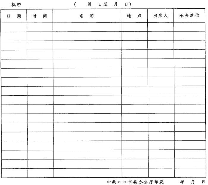 释义 | 领导同志出席会议安排表 【简介】: 领导同志出席会议安排表是党委办公部门为履行综合协调职能,帮助本级党、政、军领导同志精简和控制会议,对党、政、军几大家领导同志出席本级重要会议作统一安排时使用的一种表格式专用公文。 对领导同志出席会议,一般每周安排一次。事先,由各大家的办公部门提前将领导同志下周出席会议的安排意见报送党委办公部门,由党委办公部门提出统筹安排意见,经党委主要领导同志审定后印发各有关方面执行。表中未作安排的会议,领导同志可以不出席。 领导同志出席会议安排表的内容主要包括:日期、时间、名称、地点、出席人、承办单位等。 【范例】: 领导同志出席会议安排表 |