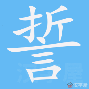 字源解说 誓,金文 = (生,产生)+ (言,许诺)+ (斤,刀斧),造字本义:古代士兵在战场上手执大刀,发咒许诺。有的金文 误将“生” (屮)与“斤” 写成“折” 。篆文 承续晚期金文字形。隶书 将篆文的 简写成 。附文言版《説文解字》:誓,約束也。从言,折聲。 附 白话版《说文解字》:誓,用以约束自己行为的发咒似诺言。字形采用“言”作边旁,采用“折”作声旁。 引申线索