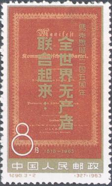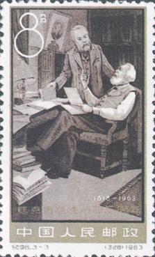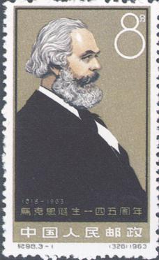 释义 | 马克思诞生一四五周年 发行日期:1963年5月5日 齿孔度数: 印刷版别:影写版 图幅:27.5×48 全张枚数:50(10×5) 设计者:孙传哲 印刷:北京邮票厂 (1)8分 马克思像 600万枚 (2)8分 全世界无产者联合起来 600万枚 (3)8分 马克思和恩格斯在工作 600万枚 (1)-(3) 3枚全 |