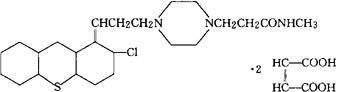 释义 | 马来酸氯噻吨胺 C24H28ClN3OS·2C4H4O4=674.16 CAS-4434-20-2 CAS-4177-58-6(clothixamide) 4-[3-(2-氯-9H-噻吨-9-亚基)丙基]-N-甲基-1-哌嗪丙酰胺,(Z)-2-丁烯二酸盐(1∶2)。 4-[3-(2-Chloro-9H-thioxanthen-9-ylidene)propyl]-N-methyl-1-piperazinepropanamide,(Z)-2-butenedioate(1∶2). 4-[3-(2-氯噻吨-9-亚基)丙基]-N-甲基-1-哌嗪-丙酰胺马来酸盐。 4-[3-(2-Chlorothioxanthen-9-ylidene)propyl]-Nmethyl-1-piperazinepropionamide maleate(1∶2). 抗精神病药,镇静药。 酰胺氯噻吨。 Clothixamide Maleate,Clotixamide Maleate,p4385B,NSC-78714. INN(Clotixamide),USAN. |