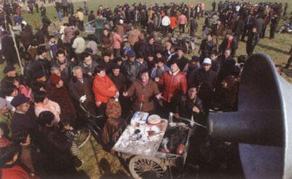 马街位于河南省平顶山市宝丰县杨庄镇,历史上是一个“商贾云集,物产集散”的繁盛之地。 马街书会是全国曲艺行当的交易盛会,历史久远,其起始年代已难确考。 每逢农历正月十三(大约公历的2、3月间),来自全国各地的艺人便负鼓携琴云集马街。 马街虽小,却是艺人心中的圣地。不论是曲艺名家,还是乡村艺人,到马街说唱,是一种化不开的情结。 艺人们说书亮艺,以书会友,切磋技艺,争当书会状元。无论田间地头,房前屋后,溪畔河边,沟坎连著沟坎,戏台连著戏台,书摊挨著书摊。 艺人们或脸对脸、或背靠背,打起简板,拉起胡琴,顷刻便陶醉其中了。在这神奇的乡音大舞台上,你唱你的,他唱他的,有人听时神采飞扬,无人听时自得其乐。 他们以天为幕,以地为台,风刮不走,雨打不散,千余台书摊汇成一个波澜壮阔的曲艺海洋。他们说古道今,唱者如在梦里,观者如痴如醉。 在千把胡琴,万双简板的颤动中,艺人们演奏著世代相传的乡音大律,尽情地释放和宣泄内心的欢悦和悲苦。  马街书会 |
