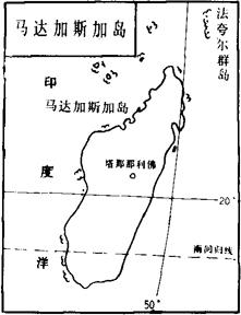 印度洋西部的世界第四大岛。 面积达59万余平方千米。位于非洲东南岸外,隔莫桑比克海峡同非洲大陆相望。 中、东部为南北走向地垒高地,一般海拔800-1500米,最高峰马鲁穆库特鲁山海拔2876米,东岸有狭窄低地,平均宽48千米,西部沿海平原宽50-190千米,岛之整体呈向西倾斜的高原地形。东部沿海地区湿润多森林,属热带雨林气候;西部较干旱,属热带草原气候。11月至次年3月为雨季,4-10月为旱季。1-4月东南部多受飓风影响。 河流众多,大河均西流注入莫桑比克海峡。森林覆盖率达17%。 动植物资源丰富,其孤立环境保存下许多原始灵长类动物,著名的有旅人蕉、狐猴、马岛灵猫等。为1960年独立的马达加斯加民主共和国的主要领土。矿藏主要有放射性矿物和石墨、云母等。大部人口从事农业,农作物以水稻为主,其次有玉米、马铃薯、木薯、豆类、花生、芝麻、华尼拉果、胡椒、亚麻等。