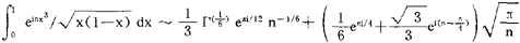 阶的估计的重要方法。 主要是对积分 进行阶的估计,其中f(x)与φ(x)都是实函数。若将被积函数看作一个向量,则它的相角应该是nf(x),当f(x)的数值不稳定,即其变化较大时,由于einf(x)的数值在-1与1之间交替变化,这样正值与负值“相互抵消”,使得相应的φ(x)einf(x)的数值对整个积分值所起的作用仅处于次要地位,而相应于f(x)变化稳定部分φ(x)einf(x)的数值,对整个积分值所起的作用,则起著主要作用,这就是驻相法的基本思想。所谓f(x)变化稳定,自然可用条件f’(x)=0来加以描述,使f’(x)=0的点x0,称为驻相点。关于这方面的主要结果有:(1)设f(z)与φ(z)在包含〔a,b〕的某个单连通域内解析,而且它们在〔a,b〕上均取实值,f’(z)仅在点x=a为零,则当f”(a)>0时, ,当f”(a)<0时,I=(-π/2nf”(a)1/2φ(a)einf(a)-1/4πi+O(1/n);(2)设f(z)与ψ(z)的条件与(1)相同,但f’(z)仅在x=6为零,则当f”(b)>0时,I=(π/2nf”(b))1/2ψ(b)einf(b)+1/4πi+o(1/n),当f”(b)<0时,I=(-π/2nf”(b)1/2ψ(b)einf(b)+1/4πi+0(1/n);(3)设f(z)与ψ(z)的条件与(1)相同,但f’(a)=0,f”(a)=0,f’”(a)>0,则I=Г(4/3)(b/nf’”(a))1/3einf(a)+1/6πiφ(a)+0(n-2/3);(4)设0<λ<1,0<μ<1,φ(x)在〔a,b〕上m次连续可微,f(x)连续可微且有关系式 f’(x)=(x-a)ρ-1(b-x)θ-1f1(x) 其中ρ≥1,θ≥1,f1(x)在〔a,b〕上正值,而且也是m次连续可微,则 其中A(n)=Am(n)+Rm(n),B(n)=Bm(n)+Qm(n),   以上结果有许多重要应用,例如,利用(1)及(2)可得,当n→∞时, ;利用(4)可得,当n→∞时, 等。 |