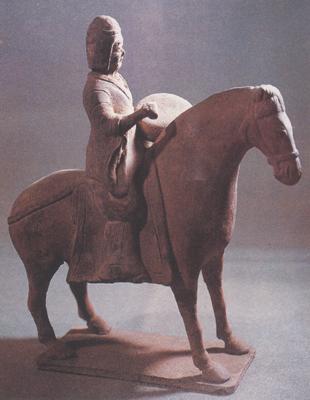 ◎陶塑/北魏 1965年河南洛阳老城东北邙山盘龙冢村元邵墓出土 高24.2厘米 长20.5厘米 陶质/河南省洛阳市博物馆藏 ●此俑头戴盔,身穿交襟宽袖短衣,袖宽垂至膝部;腰间束带,下穿扎膝散口裤,裤腿肥长掩足,上有长条褶纹;躯体宽厚,挺胸骑于马背,胸前斜置扁鼓,头右偏,举手击鼓。 马匹鞍辔齐全,胸肩发达,头较小,挺颈缓行。人物头与手的动作协调,身体好像随著鼓的敲击声在晃动。 元邵,北魏孝文帝之孙、清河王元怿之次子,爵封常山王,家资丰厚,于北魏武泰元年(公元528年)的动乱中被戮,墓中陪葬品甚多。 出土陶俑有文官武士、虎贲班剑、贵妇女仆等110多件。这件骑乐俑为其中之一,应属出行仪仗中的鼓吹之类。 |
