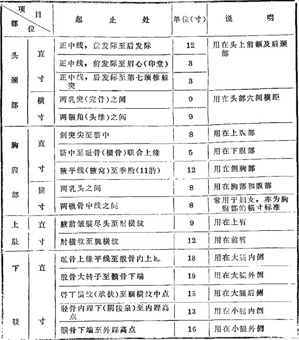 指量取穴位的一种方法。见《灵枢·骨度》。古人以骨节为标志,定出一定度数,以测量人体各部长短、大小,称骨度。用骨度作为定穴的方法,则称骨度法。即不分人体高矮肥瘦,把一定部位都折作一定分寸来量取穴位,亦同身寸之一种,后人为了定穴方便,作了个别修改。骨度分寸见表(631页)。