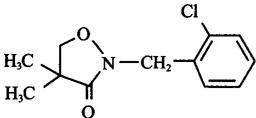 中文通用名称:异噁草酮,英文通用名称:clomazone,其他名称:豆草灵、广灭灵、灭噁草松、Command、Gamit、FMC-57020,化学名称:2-(2-氯苄基)甲基-4,4-二甲基异噁唑-3-酮,化学分子式:C12H14ClNO2,相对分子量:239.7。 化学结构式:  理化性质:原药为浅棕色黏性液体,纯品为白色粉末。相对密度1.192(20℃),沸点275.4℃,熔点25℃,蒸汽压19.2mPa。水中溶解度为1.1g/L,易溶于氯仿、甲醇、二氯甲烷、乙腈、甲苯、丙酮、己烷等有机溶剂。常温贮存稳定期1年以上,热贮存(50℃)稳定期3个月以上。 毒性:大鼠急性经口LD50为2077mg/kg(雄),1369mg/kg(雌)。 农药类别:低毒噁二唑酮类除草剂。 |