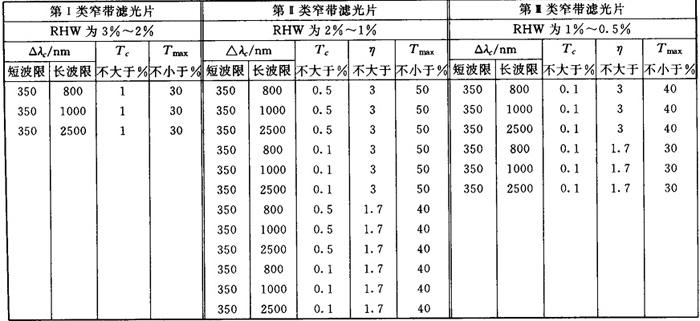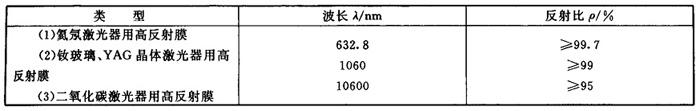 释义 | 13.光学零件镀膜 13.1 光学零件镀膜分类、符号及标注(JB/T6179-92)该标准适用于镀在光学玻璃零件上的膜层,规定了各种膜层的分类、符号及标注。 13.1.1 膜层的分类和会号 膜层的分类和符号见表2-50 表2-50 (2)双层减反射膜中心波长λ0在光谱的可见区内选定。在中心波长λ0处镀膜后零件表面中心的反射比R,按图2-25所示不大于0.3%。 (3)宽带减反射膜镀膜后零件中心允许的最大反射比Rmax和平均反射比 (a)在波长λ1-λ1+△λnm范围内,最大反射比Rmax不大于0.8%,△λ不小于220nm,λ1、λ1+△λ在光谱的可见区内选定。 (b)在425~675nm波段内的平均反射比R不大于0.5%。 (c)均匀性:单层减反射膜和宽带减反射膜零件表面有效孔径内边缘与中心的反射比偏差不大于0.3%。 13.2.2 水解法镀双层减反射膜(详见GB1318-88) 本标准适用于正钛酸乙酯和正硅酸乙脂溶液用水解法镀在光学玻璃零件上的双层减反射膜。 镀膜后零件的光学性能 (1)反射比:中心波长λ0在光谱的可见区内选定。镀膜后零件表面中心在波长0.9λ0~1.1λ0范围内任何波长处的垂直反射比不大于1%。 (2)均匀性:零件表面有效孔径的边缘与中心的反射比偏差不大于0.3%。 13.2.3 内反射膜(详见GB1322-88) 本标准适用于镀在光学玻璃零件上加有保护层的银或铝内反射膜,用其他材料镀制而成的内反射膜可作相应参考。 内反射膜的分类及镀膜后零件的光学性能见表2-51a。 表2-51a 内反射膜分类及镀膜后零件的光学性能 (b)短波截止滤光膜见图2-28。 (2)镀膜后零件的光学性能。 (a)截止波长λc规定为透射比是平均透射比 (b)截止区域λc1~λc2应在产品标准和技术规范中规定。 (c)截止区域最大透射比Tc按图2-27、图2-28所示不大于0.5%。 (d)透射区域λT1~λT2应在产品标准和技术规范中规定。 (e)透射区域的平均透射比 13.2.6 窄带干涉滤光膜(详见GB1330-88) 本标准适用于镀在光学零件上的通用型窄带干涉滤光膜,按技术要求的高、低分为三类。 表2-52 透射区域的平均透射比T (b)截止区域为△λc;截止区域内最大透射比为Tc,见图2-29。 (3)镀膜后零件的光学性能。 (a)中心波长λ0在光谱的可见区内选定,中心波长偏差△λ0和相对半宽度RHW应在产品标准或技术规范中规定。 (b)各类窄带滤光片的相对半宽度RHW和其余要求按表2-53规定。 表2-53 窄带滤光片的RHW和其余要求 13.2.7 中性滤光膜(详见GB1329-89) 本标准适用于镀在光学玻璃零件上的中性滤光膜。 (1)镀膜后零件的光学性能。 (a)白光光密度。计算白光光密度D的公式:D=log10(1/τ)。式中τ为白光透射比。 白光光密度D及其偏差应在产品标准或技术规范中规定。 (b)中性程度。在400~700nm光谱区域内,最大透射比与最小透射比之差△τ应符合表2-54规定。 表2-54 最大透射比与最小透射比之差△τ 13.2.8 分束膜(详见GB10989-89) 本标准适用于镀在光学玻璃零件上把入射光分为一定比值的反射光和透射光的膜层。 13.2.8.1 分类及说明 (1)单波长分束膜:在选定波长上要求一定的反射比与透射比之比的膜层。 (2)波段分束膜:在选定波段上要求一定的反射比与透射比之比的膜层。 (a)选定波段和比值分束膜:在选定波段上,反射比与透射比之比为一定值的膜层。 (b)白光等比分束膜:白光反射比与透射比之比为1的膜层。 13.2.8.2 镀膜后零件的光学性能 (1)单波长分束膜应在产品标准或技术规范中规定所要求的λ0、光线入射角α、反射比与透射比之比(ρ∶τ)及其偏差、反射比与透射比之和(ρ+τ)和偏振特性等。 (2)波段分束膜应在产品标准或技术规范中规定所要求的波段范围△λ、光线入射角α、反射比与透射比之比(ρ∶τ)及其偏差、反射比与透射比之和(ρ+τ)和偏振特性等。 13.2.8.3 白光等比分束膜按下列技术要求 (1)白光的反射比与透射比之比的偏差应不超过±0.2。 (2)白光的反射比与透射比之和(ρ+τ)按表2-55规定选用。 表2-55 白光的反射比与透射比之和 (3)膜层的中性程度指在420~700nm波段内的透射比最大值和最小值之差△τ不应大于10%。 13.2.9 高反射膜(详见JB/T5589-91) 本标准适用于镀在光学玻璃零件上的激光谐振腔用的高(全)反射膜层。规定了膜层的分类和技术要求。 13.2.9.1 分类 (1)氦氖激光器用高反射膜。 (2)钕玻璃、YAG晶体激光器用高反射膜。 (3)二氧化碳激光器用高反射膜。 13.2.9.2 技术要求 (1)镀膜后零件的光学性能。 (a)反射比。在特定的波长上的反射比(ρ)按表2-56规定。 表2-56 (b)光损耗。氦氖激光高反射膜(包括基底)光损耗要求小于0.2%。 (2)抗激光强度。用膜层的激光损伤阈值表示,由产品标准或技术规范规定。 (3)镀膜后零件的表面质量。 (a)外观。膜层不允许有损坏痕迹,如起皮、脱膜、裂纹和灰雾等。膜层结构致密、均匀、无针孔。 (b)表面疵病。根据GB1185的规定,按抛光表面疵病的原线数J,其个数G允许增加20%。 (c)色斑。色斑是指零件表面的局部腐蚀及在镀膜后形成的反射光中能观察到的局部干涉色突变,不允许存在。 (4)膜层的抗磨强度。 (a)磨擦。按(1a)或(2a)要求,当零件不宜进行摩擦试验时,则按(b)条款要求。 (1a)膜层能经受膜层强度试验机的摩擦,摩擦2000转不磨破。 (2a)膜层能经受压力为9.8N的橡皮摩擦头的摩擦,摩擦40次不磨破。 (b)擦拭。膜层应能经受蘸有酒精、乙醚混合液的脱脂纱布清洁擦拭。 (5)镀膜后零件对环境的适应性。 (a)恒定湿热。无包装情况下,在温度40±2℃,相对湿度90%~95%条件下保持24h,膜