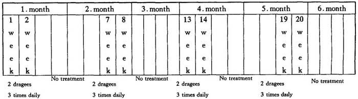 | 释义 | 14.强力痔根断 【中文释文】: 〔成分〕 每包衣片内含: 巴拉菲苯 200mg 芸香甙 30mg 干番泻叶提取物(4,5∶1) 7.5mg 〔用途〕 强力痔根断为新型口服治疗痔漏药,对痔所致瘙痒、灼痛、血管循环疾病及静脉曲张(如内痔、外痔)也有疗效。 〔用法〕 除非医生特别说明外,应每日3次,每次服2片。对于急性发作,建议疗程应不少于14d。如需长期服用,应连续治疗不少于6个月,但每个14d的疗程间允许间隔1个月。 〔长期服用〕 表4 强力痔根断长期给药方法