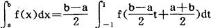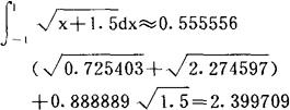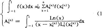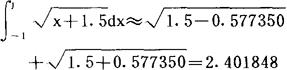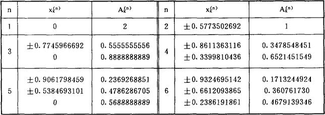 如何利用函数f(x)在某些点上的函数值,给出积分 的近似值,这是个数值积分问题。 高斯求积公式是数值积分中最常用的公式之一。  就是高斯求积公式。这里的 , 是它的n个根。在实际计算时, 及 都可通过查表给出,然后代入(1)式即可。  给出表格如下  用两点高斯求积公式,则得 (2)  若用三点高斯求积公式,则得  此积分的精确值为 。 高斯求积公式计算稳定且具有较高的精确度,当f(x)是次数≤2n-1次多项式时,(1)是精确成立的。 如果积分区间是〔a,b〕,可先通过变量替换化为〔-1,1〕上的积分:  然后再利用高斯求积公式。 |
