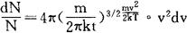 1860年英国物理学家麦克斯韦提出的气体分子运动速度的统计分布函数。 假定气体分子是理想气体模型,单个分子处在无规则运动之中,大量分子遵守一个确定的统计规律性。在速度由v到v+dv的间隔dv内,个子数dN同体系总分子数N之比为  其速度分布数为  m为单个分子质量,T为绝对温度,k= =1.38×10-16尔格/度,为玻尔兹曼常数,N0=6.0231×1023为一摩尔气体的分子数,称阿伏伽德罗常数。这个速度分布在温度为T的平衡态下成立,是麦克斯韦1860年推导出来的。由斯特恩(stern)1921年做出实验证明。 它表明理想气体的单个分子遵守经典力学的运动规律,大量分子的相互碰撞是它们运动的原因,但是单个分子何时何地撞碰,沿什么方向以多大速度运动是一个无规则的复杂折线,具有偶然性,然而大量分子构成的体系,大量分子的总体在平衡态下,在某一个速率的间隔内的分子数是恒定的,就是由麦克斯韦速度分布律决定,尽管分子仍在作不停运动,但进入某一间隔内的分子数和从这间隔出去的分子数机会相等,这就是个别偶然性和统计必然性的关系。 |