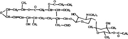 C41H67NO16=829.98 CAS-35775-82-7 3,6-二脱氧-4-O-(2,6-二脱氧-3-C-甲基-α-L-核己吡喃糖基)-3-(二甲氨基)-β-D-吡喃葡萄糖甙4″,7′-二丙酸10-(甲酰甲基)-7,13-二羟-8-甲氧-3,12-二甲基-5-氧代-4,17-二氧杂二环[14.1.0]十七碳-14-烯-9-基酯。 10-(Formylmethyl)-7,13-dihydroxy-8-methoxy-3,-12-dimethyl-5-oxo-4,17-dioxabicyclo[14.1.0]heptadec-14-en-9-yl3,6-dideoxy-4-O-(2,6-dideoxy-3-C-methyl-α-L-ribo-hexopyranosyl)-3-(dimethylamino)-β-D-glucopyranoside4″,7′-dipropionate(ester). 抗生素类药。 马立霉素。 Maridomycin. INN,JAN,USAN.
