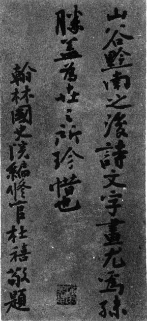 释义 | 黄庭坚松风阁诗卷跋 【简介】: 元·杜禧书。纸本。行书。纵32.1cm。台北故宫博物院藏。刊于《故宫历代法书全集》(三)。 【赏析】: 在一些著名书迹中,跋文和印迹有时也给作品增添了几分润色,使人们对作品有了更进一步的了解。跋文除对作品作一些品评外,其本身也反映了作者的修养和艺术风貌。杜禧题山谷松风阁记,观之给人以朴厚、劲利的艺术美感。虽字数不多,但迎让有序,疏朗有致,从中可以看出作者慕古追胜、娴熟沉逸的艺术风格。此跋文由于作者对山谷之仰慕,不免有些拘恭,使笔画稍有蹇钝。 |