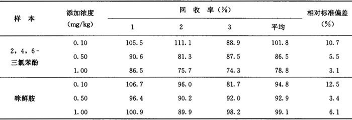 广东省农业科学院植物保护研究所 孙海滨 样本用丙酮提取,在220℃高温条件下用吡啶盐酸盐将提取物中的咪鲜胺及其所有代谢物分解成为2,4,6-三氯苯酚,液-液分配,气相色谱法(ECD)测定。 1.主要仪器及设备 气相色谱仪 电子捕获检测器(ECD) 复式电动振荡器 恒温水浴锅 硅油浴高温加热设备 高速组织捣碎机 旋转蒸发器 2.主要试剂 甲醇、丙酮、石油醚、无水硫酸钠、吡啶盐酸盐(Pyridine hydrochloride)、助滤剂545 咪鲜胺标准品、2,4,6-三氯苯酚标准品 3.检测步骤 3.1 提取 称取20.0g(净重)匀浆杧果样本,放入250mL三角瓶中,加入100mL丙酮,浸泡6h。经助滤剂抽滤,残渣用60mL丙酮振荡30min,抽滤,合并滤液。用旋转蒸发器(70℃)减压浓缩去丙酮至干固。 3.2 分解转化 干固残留物中加入8g吡啶盐酸盐,在210~230℃的硅油浴上加热1h,放置冷却。 3.3 净化 分解物加入5mL1mol/L盐酸溶液和80mL蒸馏水溶解后,用50mL×2石油醚萃取。合并石油醚相,再用0.05mol/L氢氧化钾溶液50mL×2反萃取,弃去石油醚相。合并水相,加入5mL 1mol/L盐酸,用10mL×2石油醚萃取,合并石油醚相,定容,待测。 3.4 气相色谱法测定 检测器 ECD 色谱柱 DB-35,15m×0.53mm石英交联毛细管柱 检测温度 柱温150~160℃进样口200℃检测器260℃ 载气 高纯氮30mL/min 进样量 2μL 保留时间 1.4min 4.结果计算 外标(峰面积)-标准曲线法定量。 2,4,6-三氯苯酚换算为咪鲜胺的换算系数为1.906。 5.灵敏度、准确度和精确度 最小检出量 1×10-11g。 最低检测浓度 0.01mg/kg。 回收率 杧果中添加2,4,6-三氯苯酚和咪鲜胺0.10~1.00mg/kg时,平均回收率为78.8%~101.8%和92.9%~99.1%。见表2-25-2。 相对标准偏差 3.1%~12.5%,见表2-25-2。 表2-25-2 杧果中2,4,6-三氯苯酚和咪鲜胺添加回收率及相对标准偏差实验结果 |