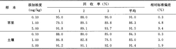 天津市农业科学院中心实验室 郭永泽 张玉婷 刘凤来 宋淑荣 石守良 样本用石油醚提取,气相色谱法(FPD)测定。 1.主要仪器及设备 气相色谱仪 火焰光度检测器(FPD) 样品粉碎机 空气浴振荡器 旋转蒸发器 2.主要试剂 石油醚(重蒸)、无水硫酸钠 毒死蜱标准品 3.检测步骤 3.1 提取 称20g粉碎样本,加100mL石油醚,振荡提取4h,过滤。将滤液经无水硫酸钠脱水后,浓缩至近干,用石油醚定容至4mL,待测。 3.2 气相色谱法测定 检测器 FPD 色谱柱 2m×3mm玻璃柱,2%OV-101/ChromosorbWAW-DMCS,80~100目 检测温度 柱温200℃;进样口220℃;检测器220℃ 载气 高纯氮,60mL/min 燃烧气 氢气72mL/min,空气30mL/min 保留时间 0.78min 4.结果计算 外标(峰面积)-具标准曲线法定量 5.灵敏度、准确度和精确度 最小检出量 2×10-10g。 最低检测浓度 苹果和土壤均为0.020mg/kg。 回收率 苹果和土壤中添加毒死蜱0.10~5.00mg/kg时,平均回收率分别为86.3%~91.5%和83.0%~91.4%。见表1-8-2。 相对标准偏差 0.3%~9.4%,见表1-8-2。 表1-8-2 苹果和土壤中毒死蜱回收率及相对标准偏差实验结果