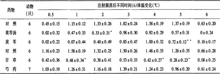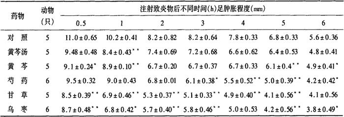 注:与对照组比:*P<0.05,* *P<0.01(下同);给药剂量均为20ml/kg 2.解热作用[1] 选择体温正常的家兔34只,随机分为5组,每组6~7只,实验分两批进行。黄芩汤皮下给药0.5h后,由耳静脉注射伤寒,副伤寒甲、乙菌苗0.7ml/kg,致热0.5、1、2、3、4、5h分别测量体温变化,各组肛温差值分别与对照组比较,经统计学处理,结果表明黄芩、黄芩汤和甘草均有明显的解热作用(P<0.05),芍药组未见明显退热作用,详见表2-28-2。 表2-28-2 黄芩汤及其组成药物对大鼠酵母关节肿的影响(