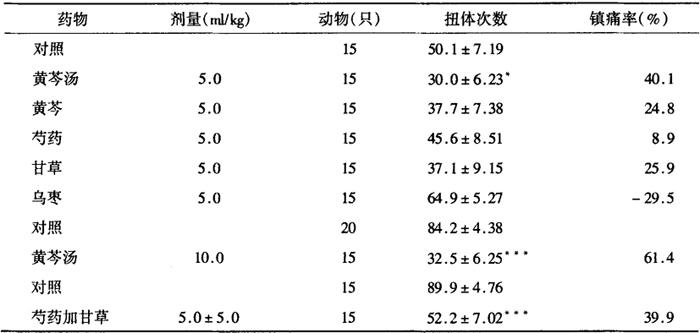 注:药物剂量均为5ml/kg 3.镇痛作用[1] 3.1 对醋酸所致小鼠扭体反应的影响[3] 黄芩汤皮下注射(10g原药材/kg)30min后,腹腔注射1%醋酸生理盐水1.0ml/只,观察30min内各组小鼠扭体次数。结果(表2-28-3)表明,黄芩汤能明显抑制醋酸引起的扭体反应,具有一定的镇痛作用。但黄芩汤的各组成药物,黄芩、芍药、甘草和乌枣均无明显抑制作用,另用芍药甘草汤进行实验,却能看到非常明显的抑制作用(P<0.001),说明黄芩汤的镇痛作用可能主要是芍药和甘草的配伍作用,表2-28-3。 表2-28-3 黄芩汤及其组成药物对小鼠醋酸扭体反应的影响