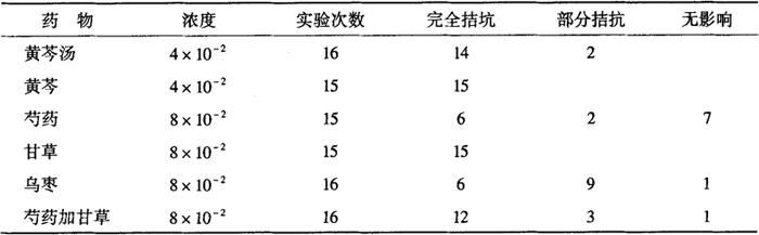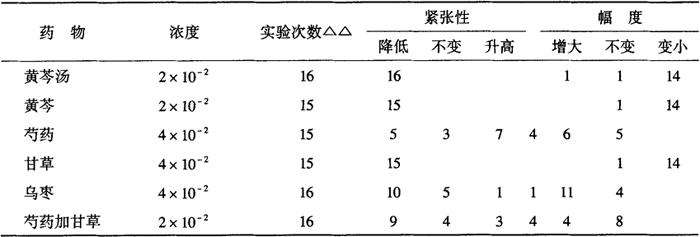 3.2 对小鼠甩尾实验的影响 按常用方法(水浴温度49±0.5℃),小鼠经预先筛选,剔除在3s内甩尾和30s内不甩尾者,选用40只小鼠随机分2组,测定给药前后痛阈变化(以小鼠甩尾潜伏期作为痛阈指标)。结果表明:黄芩汤20ml/kg口饲给药8d,末次给药后3h,能明显延长痛阈反应时间。对照组痛阈反应时间为1.11±0.65s,黄芩汤组为4.7±1.42s(P<0.001)。 4.解痉作用[1] 取雄性大鼠,分别断头处死,迅速剖开腹腔剪取回盲部附近一段回肠,立即放台氏液中洗涤干净,剪成1.5~2cm的肠段,按离体器官实验方法记录肠段运动情况。观察加试液黄芩汤及其组成药物前后,离体回肠的紧张性和收缩幅度的变化。冲洗3次,待肠管恢复正常后,用乙酰胆碱(10-5、0.2ml)造成回肠强直性收缩时,再分别加入上述药液,观察黄芩汤及其组成药物对外源性乙酰胆碱的拮抗作用。结果(表2-28-4)表明黄芩汤、黄芩、甘草能抑制正常离体回肠的运动。黄芩汤及其各组成药物和芍药加甘草都能明显抗乙酰胆碱所致回肠段的强直性收缩。 表2-28-4 黄芩汤及其组成药物对正常大鼠离体回肠的影响