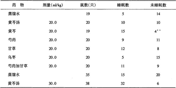 注:芍药加甘草1∶1(下同),△△即动物数,每种药物在同一只大鼠回肠段上,只作一次对比观察 5.镇静作用[1] 取小鼠随机分成6组,分别灌胃给黄芩汤及其组成药物1h后,对照组及给药组均腹腔注射阈下剂量的戊巴比妥钠(30mg/kg)。观察15min,以翻正反射消失超过1min以上者,作为睡眠指标。用X2值测定给药组与对照组之间有显著差异。结果表明:黄芩20.0/kg和黄芩汤30.0ml/kg能使小鼠睡眠数显著增多,与对照组比较有显著差别。芍药甘草和乌枣未见明显作用(表2-28-6)。 表2-28-5 黄芩汤及其组成药物对乙酰胆减引起大鼠离体回肠强直性收缩的影响