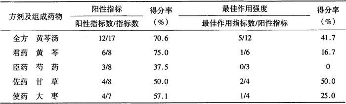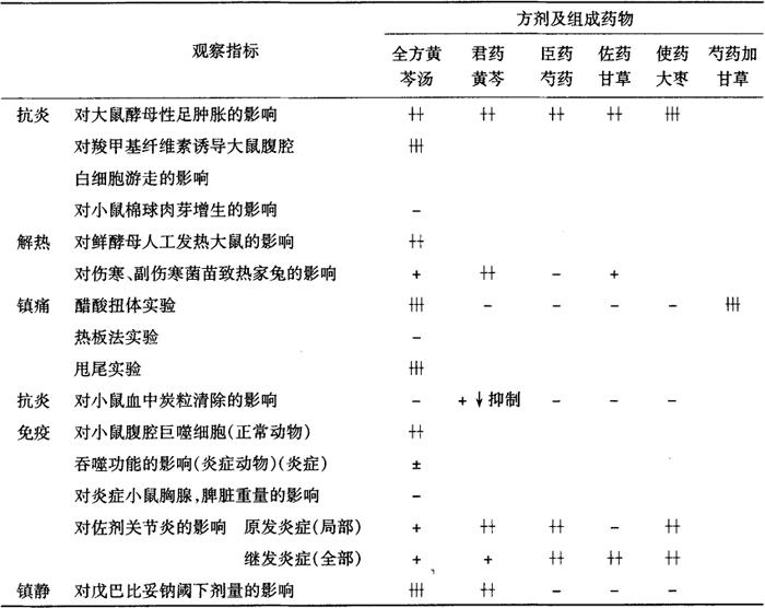注:表各内项药理实验表明,用t测验进行统计学处理,+号代表P<0.05; 表2-28-8 黄芩汤及其组成药物药效指标评分比较