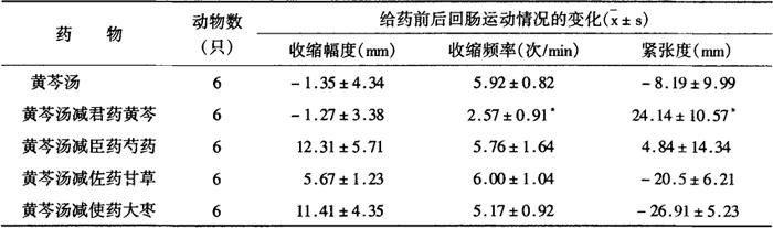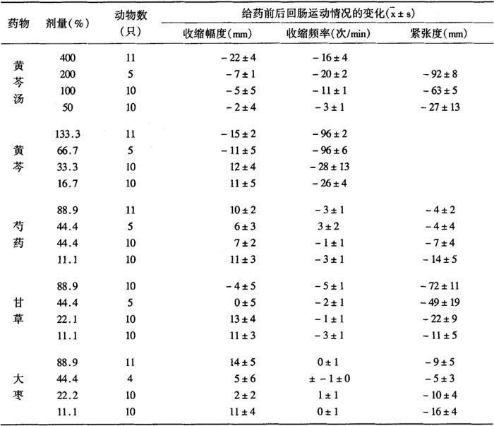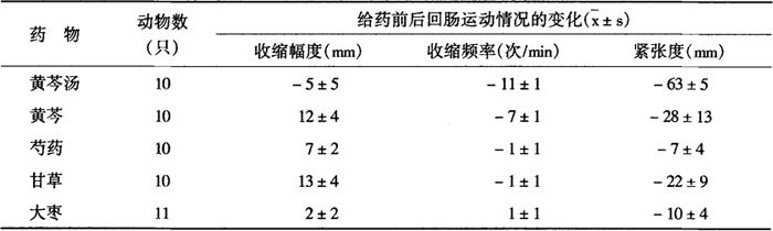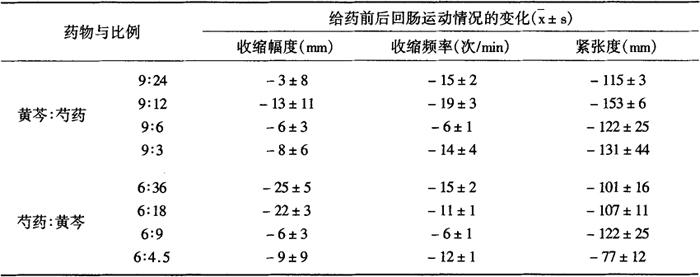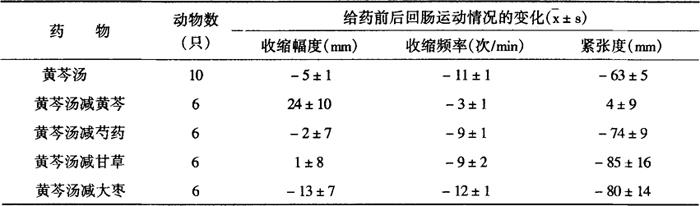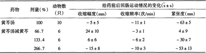 注:每个剂量分别与第三行古方剂量比较 表2-28-13 黄芩汤减黄芩加大其他药味剂量对大鼠回肠运动的作用