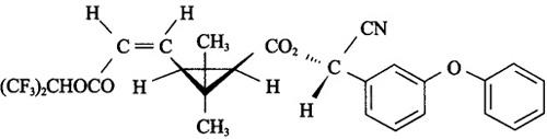 中文通用名称:氟丙菊酯,英文通用名称:acrinathrin,其他名称:罗速发、Rufast,化学名称:(S)-α-氰基3-苯氧基苄基(Z)-(1R,3R)-3-(2,2,2-三氟-1-三氟甲基乙氧基甲酰)乙烯基-2,2-二甲基环丙烷羧酸酯;化学分子式:C26H21F6NO5;相对分子量:541.44。 化学结构式:  理化性质:原药为白色粉末,熔点81.5℃,蒸汽压4.4×10-5mPa(25℃)。在水中的溶解度<0.02μg/mL(25℃),乙酸乙酯、丙酮、氯仿、二氯甲烷中的溶解度>500g/L,乙醇40g/L,己烷10g/L。光稳定性(半衰期)50h,常温贮存稳定性大于2年。酸性条件下稳定,中性或碱性中易分解。 毒性:大、小鼠急性经口LD505g/kg(原药在玉米油中),大鼠急性经皮LD50>2g/kg。 农药类别:低毒拟除虫菊酯杀虫剂。 |