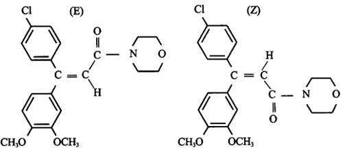 中文通用名称:烯酰吗啉,英文通用名称dimethomorph,其他名称:安克、达灭芬,化学名称:4-[3-(4-氯苯基)-3-(3,4-二甲氧基苯基)丙烯酰]吗啉(Z与E异构体比例4∶1),化学分子式:C21H22ClNO4,相对分子量:387.9。 化学结构式:  理化性质:纯品为白色结晶体,熔点为127~148℃,(Z)-异构体169.2~170.2℃,(E)-异构体135.7~137.5℃,蒸汽压24mPa(20℃)。常温下溶解度:水<50mg/L,二氯甲烷315g(Z)/L,二甲基甲酰胺40g(Z)/L、272g(E)/L,环己酮27g(Z)/L,丙酮15g(Z)/L、88g(E)/L,甲醇7g(Z)/L,甲苯7g(Z)/L。稳定性:在暗处稳定5天以上,在日光下(Z)-异构体(有杀菌力)和(E)-异构体互变;水解缓慢。 毒性:大鼠急性经口LD50为3.9g/kg,小鼠急性经口LD50>5g/kg,大鼠急性经皮LD50>2g/kg;大鼠急性吸入LC504.2mg/L空气。野鸭急性经口LD50>2g/kg,鱼毒LC50(96h)14mg/L。 农药类别:低毒杂环类杀菌剂。 |