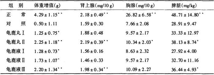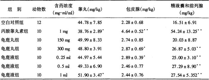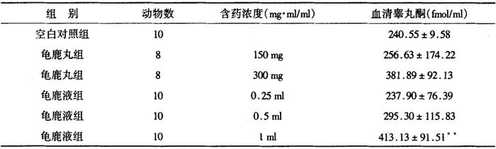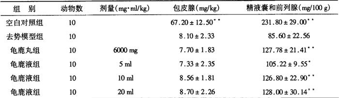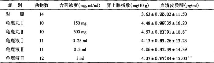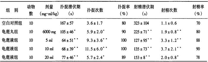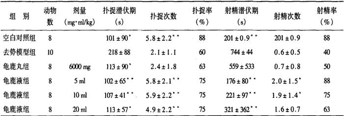 释义 | 龟板胶 鹿角胶 【中医理论】 龟板胶、鹿角胶,临床上常常配伍使用,合煎是治疗精脱耳聋之名方,《证治宝鉴》卷三方名龟鹿二仙膏。也是《证治准绳》龟鹿二仙胶方的主药,具有阴阳双补,治疗精血不足之证。龟板胶甘咸平,滋阴补血之力大于龟板,通任脉而补阴,并有健骨、止血作用,能收孤阳之汗,安欲脱之阴。鹿角胶甘平微温,温补下元,能通督脉,壮元阳,充精髓,强筋骨,止血崩,对元气不足,阳事不兴,畏寒乏力,四肢痿弱等证有峻补元阳,强筋健骨的功效。两药合用,阳生于阴,阴生于阳,阴阳俱补,大补精髓。二药又为异类血肉有情之品,能峻补阴阳以生气血、养精髓,故共进可治精脱之耳聋。一般需烊化服用,又治疗崩漏带下,虚性出血及阴疸内陷诸证。再配大补元气的人参,滋补肝肾的枸杞,则名龟鹿二仙胶,滋阴补阳的力量更强,是一个比较典型的阴阳双补方剂。 【药理研究】 1.对雄性生殖系统的影响 1.1 对未成熟雄性小鼠睾丸、包皮腺和附性器官的影响[1] 选取健康雄性小鼠72只,体重为11±1g,随机分组后,分别灌胃给药,每日1次,连续6d,阳性对照组皮下注射丙酸睾丸素(20mg/kg,丙酸睾丸素以2%阿拉伯树胶生理盐水悬液配制),末次给药后第2d处死动物。剖取睾丸、包皮腺,前列腺和精液囊,精密称重,计算脏器指数,比较其差异。见表12-75-1。 表12-75-1 龟鹿制剂对未成熟雄性小鼠睾丸、包皮腺和附性器官重量的影响( 注:与空白对照组比较:*P<0.05,* *P<0.01 表12-75-1结果表明,龟鹿补肾口服液中、低剂量组对未成熟雄性小鼠睾丸重量的影响不明显,与空白对照组比较,差异无显著性(P>0.05),高剂量组与空白对照组比较差异有显著性(P<0.05)。丙酸睾丸素可致小鼠睾丸萎缩,与空白对照组比较,差异有显著性(P>0.01)。龟鹿补肾丸高、低剂量组,口服液低剂量组和丙酸睾丸素组对包皮腺均有明显增重作用,与空白对照组比较,差异有显著性(P<0.05),其他各组差异不明显。除龟鹿补肾丸低剂量组外,各用药组对前列腺和精液囊增重均明显,与空白对照组比较,差异有非常显著性(P<0.01);龟鹿补肾口服液三种剂量组间作用无明显差异(P<0.05)。 3.2 对未成熟雄性大鼠血清睾丸酮水平的影响[1] 选取健康雄性大鼠56只,体重为120±10g,随机分组后,分别灌胃给药,每日1次,连续14d。末次给药后禁食12h,0.6%戊巴比妥钠(7ml/kg)腹腔注射麻醉,心脏取血,分离血清,用放射免疫法测定血清睾丸酮水平。见表12-75-2。 表12-75-2 龟鹿制剂对未成熟雄性大鼠睾丸酮水平的影响(x±s) 与空白对照组比较:* *P<0.01 表12-75-2结果表明,龟鹿补肾口服液高低剂量组能明显提高未成熟雄性大鼠血清睾丸酮水平,与空白对照比较,差异有非常显著性(P<0.01),中、低剂量组和丸剂组提高作用均不明显(P>0.05)。 1.3 对去势雄性大鼠血附性器官和包皮腺的影响[1] 选取健康雄性大鼠60只,体重为210±10g,动物在乙醚麻醉下消毒阴部皮肤,摘除双侧睾丸,术后同时肌注青霉素G钠4万U/kg。去势手术后第2d动物随机分组,并灌胃给药,每日1次,连续10d,药后第2d称取体重,处死动物,迅速剖取精液囊、前列腺及包皮腺,称取重量,计算脏器指数,比较各组的差异。见表12-75-3。 表12-75-3 龟鹿制剂对去势雄性大鼠包皮腺和附性器官重量的影响(x±s) 与模型对照组比较:*P<0.05,* *P<0.01 表12-75-3结果表明,各用药组对去势雄性大鼠包皮腺作用均不明显(P>0.05)。龟鹿补肾丸和龟鹿补肾口服液3种剂量对去势雄性大鼠精液囊和前列腺均有明显的增重作用,与去势模型对照组比较,中剂量和高剂量组差异均有非常显著性(P<0.01),低剂量组差异有显著性(P<0.05)。丸剂和口服液比较,差异不明显(P>0.05)。 1.4 对正常雄性大鼠交配能力的影响[1] 选取健康成熟大鼠100只,体重为235±15g,雌雄各半。雌性大鼠先行双侧卵巢切除术(术后青霉素G钠4万U/kg抗感染3d,并按实验室常规饲养14d。雄性大鼠随机分组后分别灌胃给药,每日1次,连续14d。实验前48h,雌性大鼠皮下注射苯甲酸雌二醇20mg/只,4h前再次经皮下注射黄体酮注射液500μg/只。雄性大鼠末次药后1h,正式开始实验。实验时,先将雄大鼠单独放入55cm×35cm×22cm铁笼中5min,使其适应新的环境,然后每笼加入1只雌鼠,并开始记录下列指标:扑捉潜伏期:自雌鼠投入至雄鼠第一次扑捉雌鼠的时间(雄鼠扑至雌鼠背部作交配动作为扑捉指标);射精潜伏期:自雌鼠投入至雄鼠发生第一次射精的时间(雄性扑至雌鼠并强烈地收缩臀部为射精指标);20min内雄鼠扑捉雌鼠次数及射精次数;20min内雄鼠发生扑捉率(%)及射精率(%)。 表12-75-4结果表明,龟鹿补肾丸和龟鹿补肾口服液能明显提高正常雄性大鼠交配能力,表现为合笼后,雄性大鼠扑捉雌鼠潜伏期及射精潜伏期均明显缩短,20min内扑捉次数和射精次数也明显增加,与空白对照组比较,差异有非常显著(P<0.01)。两者比较,口服液的作用强于丸剂。同时表明,各用药组雄性大鼠在20min内扑捉率及完成射率均高于空白对照组(P<0.05)。 表12-75-4 龟鹿制剂对正常雄性大鼠交配能力的影响(x±s) 注:与空白对照组比较:*P<0.05,* *P<0.01 1.5 对去势雄性大鼠交配能力的影响[1] 选取健康成熟大鼠100只,体重为235±15g,雌雄各半,分别进行双侧卵巢和睾丸摘除术,术后同时以青霉素G钠(4万U/kg)抗感染3d。术后雄鼠随机分组,并分别灌胃给药,每日1次,连续14d,雌鼠按常规饲养14d。实验前48h雌鼠皮下注射苯甲酸雌二醇20g/只,4h前再次经皮下注射黄体酮500μg/只。去势雄鼠