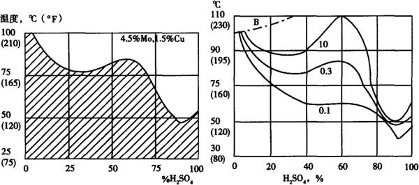 图1-250 00Cr20Ni25Mo4.5Cu在H2SO4中的腐蚀 (阴影区内的腐蚀速度<0.3mm/a)