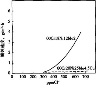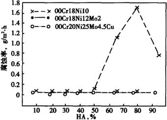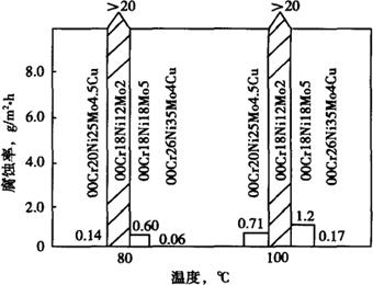 图1-254 00Cr20Ni25Mo4.5Cu在湿法H3PO4中的腐蚀 (50%P2O5+3%SO42-+0.5%F-+60ppmCl-+0.6%Fe3+)