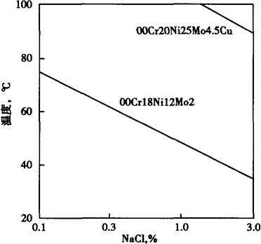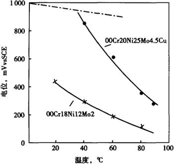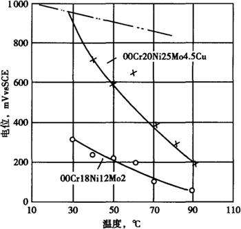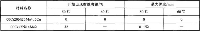 图1-264 00Cr20Ni25Mo4.5Cu在沸腾草酸中的腐蚀 b.晶间腐蚀 00Cr20Ni25Mo4.5Cu的耐晶间腐蚀性能良好,可通过任何晶间腐蚀检验方法检验。 c.点腐蚀和缝隙腐蚀 00Cr20Ni25Mo4.5Cu的耐点蚀性能见图1-265至图1-266,耐缝隙腐蚀性能见图1-267和表1-244。
