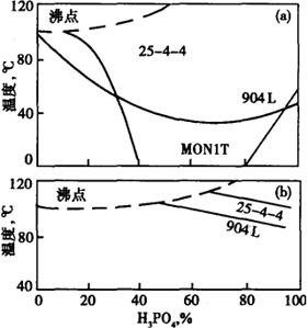 释义 | 00Cr25Ni4Mo4Ti(UNSS44635) 00Cr25Ni4Mo4Ti钢是以Ti稳定化的超低碳、氮的高铬钼铁素体不锈钢,它在海水和含氯化物介质中具有极好的耐孔蚀、耐缝隙腐蚀性能。它具有良好的强度、韧性和可焊性,即使在焊后于零下温度仍有一定的韧性。它主要用于海水或其他含氯化物溶液的工厂,可制作洗涤器、冷凝器和热交换器。 (1)化学成分 00Cr25Ni4Mo4Ti钢的化学成分见表2-23。 表2-23 00Cr25Ni4Mo4Ti钢的化学成分,% (2)物理性能 密度ρ:7.8g/cm3 比热容C:20℃时,400J/kg·K 线膨胀系数α:20~100℃,11×10-6/K 20~200℃,11×10-6/K 20~400℃,11.5×10-6/K 导热系数λ:20℃ 22W/m,K 100℃ 23W/m,K 200℃ 24W/m,K 400℃ 25W/m,K 弹性模量E:20℃时 220000MPa (3)力学性能 00Cr25Ni4Mo4Ti钢室温力学性能见表2-24。 表2-24 00Cr25Ni4M04Ti钢耐腐蚀性能 (4)耐蚀性 a.耐孔蚀性 表2-25列出几种钢在不同温度5%Nacl中的孔蚀电位(击穿电位),孔蚀电位愈高,耐孔蚀性愈好。表2-26列出几种钢在10%FeCl3,6H2O溶液中临界孔蚀温度(C.P.T)。临界孔蚀温度愈高,钢的耐孔蚀性愈好。 表2-25 几种材料的孔蚀电位 注:①合金825-0Cr21Ni42Mo3Cu2Ti 表2-26 几种材料的临界孔蚀温度 b.缝隙腐蚀 表2-27列出几种钢在10%FeCl3·6H2O中临界缝隙腐蚀温度(CCT)。临界缝隙腐蚀温度愈高,耐缝隙腐蚀性愈好。 表2-27 几种材料的临界缝隙腐蚀温度 c.应力腐蚀破裂性 表2-28列出了在40%CaCl2,100℃溶液中,施加90%屈服强度的轴向应力,测定其破裂时间。在Wick试验(1500ppmCl-的NaCl,100℃)中,00Cr25Ni4Mo4Ti是耐应力腐蚀的。但是正像奥氏体和铁素体+奥氏体双相钢一样,在沸腾MgCl2140℃溶液中则是不耐应力腐蚀破裂的。 表2-28 在40%CaCl2100℃溶液中应力腐蚀破裂性 d.耐均匀腐蚀 图2-31示出00Cr25Ni4Mo4Ti钢在硫酸溶液,磷酸溶液中的等腐蚀曲线。 图2-31 00Cr25Ni4Mo4Ti在硫酸中(a)、磷酸中(b)的等腐蚀曲线 (曲线F腐蚀率<0.1mm/年,904L-00Cr20Ni25Mo5Cu) e.晶间腐蚀 00Cr25Ni4Mo4Ti钢,焊后无晶间腐蚀倾向。 (5)冷热加工性和热处理 00Cr25Ni4Mo4Ti钢有良好的热加工性,容易锻造,热轧,它有良好的冷成型,弯曲,管的滚压扩孔及其他性能,但是由于高的屈服强度,成型最初阶段需要较大的能量,而随后由于较小的冷作硬化,所以不用进行中间退火。00Cr25Ni4Mo4Ti钢不适于拉伸成形操作,所以不推荐用作板式换热器。 热处理,00Cr25Ni4Mo4Ti加热至1000℃,水冷。 (6)焊接性 00Cr25Ni4Mo4Ti钢有良好的可焊性,焊前不需予热,焊后不需热处理,00Cr25Ni4Mo4Ti钢可用TIG焊,也可采用其他焊接方法。为了获得最好的耐蚀性,应选用与母材相同成分的填充金属,00Cr25Ni4Mo4Ti焊前焊后冲击韧性良好,焊缝和热影响区脆性转变温度在0℃以下。 (7)典型用途 海水及各种含氯化物溶液的容器,洗涤器,冷凝器和热交换器。 |