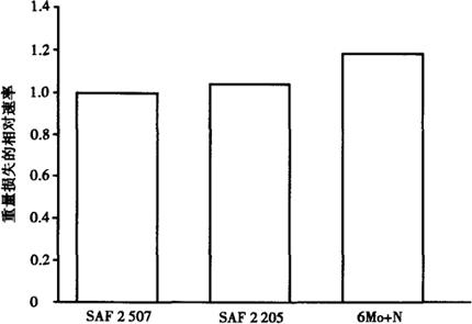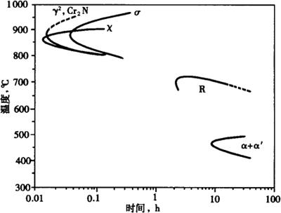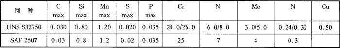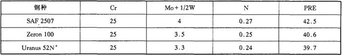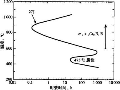 释义 | 00Cr25Ni7Mo4N 00Cr25Ni7Mo4N钢是瑞典近年开发的超级双相不锈钢,商业牌号为SAF 2507,主要用于苛刻的介质,尤其是含氯的环境,如海水等。钢中的高铬、高钼和高氮的平衡成分设计,使钢具有很高的耐应力腐蚀,耐点蚀和耐缝隙腐蚀的性能,而且在有机酸和一定范围的无机酸中也有很低的腐蚀率。一些国家已纳入标准,如美国的UNS S32750,德国的DIN X2CrNiMoN 2574,瑞典的SS 2328等。美国机械工程学会也认可2507钢适用于ASME标准的锅炉和压力容器以及化工厂和炼油厂的管道标准。 (1)化学成分和显微组织 SAF 2507钢的典型化学成分见表4-78。 表4-78 SAF 2507超级双相不锈钢的化学成分,wt% 此钢经固溶处理后,两相a/γ比约为50/50。高温下两相组织比常规双相不锈钢要稳定,无疑对焊接HAZ有着重要的意义。 SAF 2507钢的TTT曲线见图4-60。 图4-60 SAF 2507双相不锈钢的TTT曲线 (2)力学性能 表4-79列出钢管和钢板的室温力学性能,表4-80为钢板的高温力学性能。图4-61为相应韧性为27J的时间-温度-相变曲线。有σ相和475℃两个脆性区。 表4-79 SAF 2507双相不锈钢的室温力学性能 表4-80 SAF 2507双相不锈钢的高温力学性能 图4-61 SAF 2507钢韧性为27J的时间-温度-相变曲线图 (3)耐蚀性 a.点蚀与缝隙腐蚀 几种超级双相不锈钢的耐点蚀当量(PRE)值见表4-81,在不同中性氯化物溶液中SAF 2507钢的CPT值见图4-2,比其他的双相不锈钢有更高的CPT值。按照ASTM G48A,G48B在6%FeCl3溶液中经24h试验后确定的CPT和CCT值如图4-62所示。SAF 2507钢有很好的耐点蚀和缝隙腐蚀性能。 表4-81 几种超级双相不锈钢平均成分的PRE值 PRE=%Cr+3.3×%Mo+16×%N 图4-62 SAF 2507钢与其他几种钢的临界点蚀和临界缝隙腐蚀温度 (6%FeCl3溶液,24h)