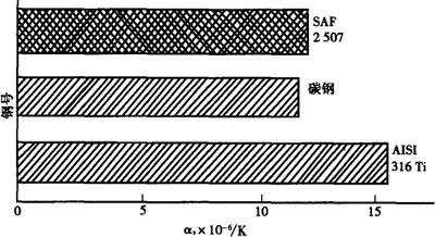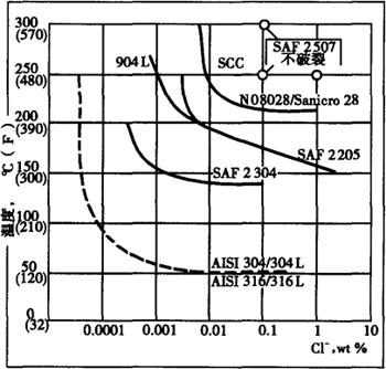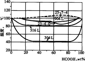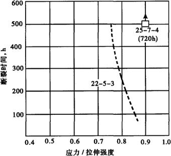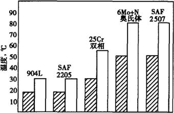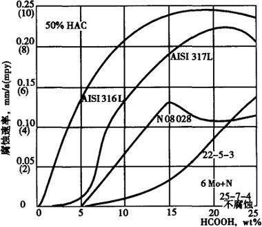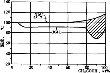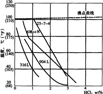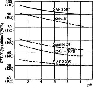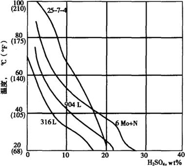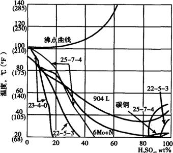 在600mV电位下和不同pH值的3%NaCl溶液中测定的几种钢对比的CPT值如图4-63所示。 图4-63 在不同pH值的3%NaCl溶液中的几种不锈钢的CPT值对比 (+600mV SCE,Sanicro28-00Cr27Ni31Mo3.5Cu) b.应力腐蚀 图4-64是在高压釜的含氧(约8ppm)氯化物溶液中,SAF 2507钢与其他几种不锈钢的SCC试验结果,外加应力相当于在该温度下钢的屈服强度值,试验时间为1000h,低于曲线将不发生SCC。 图4-64 SAF 2507钢和其他几种不锈钢在含氧中性氯化物溶液中的应力腐蚀抗力 在H2S-Cl-的环境中,按NACE TM01-77标准(通入饱和H2S的5%NaCl、0.5%HAC水溶液)进行应力腐蚀试验,结果见图4-65,外加应力小于90%拉伸强度时,SAF2507钢不发生SCC。NACEMR01-75列出此钢在酸性环境中,H2S分压低于0.01MPa时,使用温度可达232℃。但是,与在单一含氯化物的环境中相比,超级双相不锈钢在H2S-Cl-中的耐SCC性能较高铬镍的奥氏体不锈钢为差,如远不如Sanicro28钢。 图4-65 在NACE室温溶液(NACE TM01-77)中SAF 2507钢的恒载荷应力腐蚀试验结果 c.晶间腐蚀 SAF 2507钢的含碳量通常小于0.02%,一般控制在0.015%,组织中未发现有碳化物的析出。因此,低碳含量以及铁素体相的存在使钢的敏化问题可以忽略。 d.均匀腐蚀 SAF 2507钢在一些有机酸和无机酸环境中具有良好的耐均匀腐蚀性,例如在甲酸和醋酸中可以和高合金奥氏体不锈钢相媲美。图4-66为该钢在50%HAC和不同浓度的HCOOH的沸腾溶液中的腐蚀率。图4-67为在不同浓度的HCOOH中的等腐蚀曲线图和图4-68为在不同浓度HAC中的等腐蚀曲线图,两图中的曲线代表0.1mm/a的腐蚀率。 图4-66 SAF 2507钢和其他不锈钢在50%HAC及不同浓度HCOOH混酸的沸腾溶液中的腐蚀速率 (试验时间1+3+3d) 25-7-4和22-5-3分别为SAF 2507和SAF 2205钢的代称;N08028-Sanicro 28;6Mo+N-00Cr20Ni18Mo6CuN 图4-67 SAF 2507钢和其他不锈钢在不同浓度HCOOH中的等腐蚀图 (腐蚀速率为0.1mm/a) 图4-68 SAF 2507钢在不同浓度HAC中的等腐蚀图(腐蚀速率为0.1mm/a) (曲线阴影部分表示304L钢产生局部腐蚀,316L和25-7-4的曲线与介质的沸点相吻合) 在不同浓度H2SO4及含2000ppm Cl-的H2SO4中的等腐蚀曲线图分别见图4-69、图4-70,在低浓度HCl中的等腐蚀曲线图见图4-71。从图中可看出:SAF 2507钢在这些腐蚀介质中都具有好的耐腐蚀性,虽然其使用还受到一定的局限。 图4-69 SAF 2507(25-7-4)钢及其他不锈钢在自然通气H2SO4中的等腐蚀图 (腐蚀速率0.1mm/a) 图4-70 在含有2000ppm Cl-的H2SO4溶液中SAF 2507(25-7-4)钢与其他奥氏体不锈钢的等腐蚀图 (腐蚀速率0.1mm/a) 图4-71 SAF 2507(25-7-4)钢在不同浓度HC1中的等腐蚀图 (腐蚀速率为0.1mm/a) e.磨损腐蚀 由于SAF 2507钢具有高硬度和高耐腐蚀性的良好结合性能,在带有高磨损性固体颗粒的流动介质或者是在高流速的介质中,该钢有良好的耐磨蚀性能。例如用于输送含砂的海水或是制造腐蚀介质中使用的泵及其他机械部件。图4-72示出SAF2507和6Mo+N奥氏体不锈钢在含有0.025%~0.25%砂粒和8.9~29.3m/s流速的合成海水中进行暴露试验后的相对质量失重速率。 图4-72 SAF 2507钢及6Mo+N奥氏体不锈钢在含有0.025%~0.25%砂粒和8.9~29.3m/s流速的合成海水中的相对质量失重速率(水温25℃) (4)物理性能 见表4-84~4-88,图4-73。 图4-73 SAF 2507的线膨胀系数(20~100℃) (5)焊接性能 SAF 2507钢可用GTAW,GMAW,SMAW和SAW等焊接方法进行焊接,所使用的焊接材料见表4-82。25.10.4L用于GTAW法焊接,25.10.4LR和25.10.4.LB用于手工焊接,当焊件有较高韧性要求时,多采用25.10.4.LB碱性焊条。异种钢焊接时采用的焊接材料见表4-83。 表4-82 SAF 2507钢使用焊接材料 表4-83 SAF 2507钢与异种钢焊接时使用的焊接材料 注:①Sanicro 60(焊丝)为Cr22Mo9Nb3.5Ni合金; ②Sanicro 60(焊条)为Cr21Mo9Nb3.5Ni合金。 建议使用的线能量:0.2~1.5kJ/mm,为避免快速冷却,厚板焊接一般采用上限值,薄板焊接多采用下限值,控制层间温度不得超过150℃。 GTAW法焊接时,采用纯氩或Ar+2%N2保护。 (6)冷、热加工性能 热成型温度范围有限,温度太低时,塑性较差的铁素体在变形区会严重开裂,温度过高时,铁素体过软也可能发生热撕裂,因此温度在控制中十分关键,SAF 2507的热成型(加工)温度范围为1200~1025℃。热加工后的工件需进行固溶水淬。双相不锈钢在固溶温度下非常软,若工件没有足够的支撑,会发生扭曲和变形,这对大口径薄壁管材十分重要,扭曲的产品再成型或矫直比奥氏体不锈钢困难。 SAF 2507钢在冷成型后,例如冷弯,一般变形量不超过10%~15%,不需要进行随后热处理,但是在苛刻的介质条件下或是冷变形量较大量,还是要进行1050~1120℃加热,随后空冷和水冷处理。 (7)用途 此钢用于含氯化物的苛刻介质,如化工、石化和制造等工业,例如含胺的20%NaOH溶液,含Cl-及H2S介质,高浓度甲酸及无水醋酸等,普遍用于炼油、石化厂热交换器、海水冷凝器等。 |