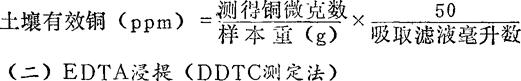 释义 | 0.1N HCl浸提(DDTC测定法) 1.适用范围:0.1NHCl适用于提取酸性土壤中有效铜,缺铜的临界值为1.9ppm。DDTC比色法测钢的适测范围是:10-30μg铜。 2.试剂配制 (1)0.1NHCl:将盐酸蒸馏纯化或者用等温扩散法纯化。 (2)1%DDTC溶液:DDTC钠盐在酸性溶液中不稳定,故须溶于稀碱溶液0.01NNaOH中,并保存于冰箱中,可使用数日。还可采用固体试剂,即将1份DDTC钠盐与9份NaCl在玛瑙研钵中研磨,使之混合均匀,每次用量为50mg左右。 (3)四氯化碳(CCl4):不含铜,可自行蒸溜纯化。 (4)铜标准溶液:将0.3928g硫酸铜(CuSO4·5H2O)溶于1N稀硫酸中,定容成1L,此为100μg/ml铜溶液。将其稀释50倍成为含铜2μg/m1的标准溶液。也可用纯铜片配制,将纯铜片溶于6NH2SO4中,浓度同上。 (5)柠檬酸铵—EDTA混合液:溶解200g柠檬酸铵和50gEDTA于1L水中,用1∶1NH4OH调节至pH8.5。 3.测定步骤 称取通过2mm尼龙网筛的风干土壤5g,放入150m1三角瓶中,加入50m1 0.1NHCl,在振荡机上振荡1.5h。用离心机分离或者滤出清液。 吸取10ml滤液(含铜在10-30μg间)放入125m1分液漏斗中,加柠檬酸铵—EDTA混合液25ml,混匀后加入1%DDTC溶液3ml,约10min后反应完全,再加入CCl410m1,摇动分液漏斗5min,静放使水层和CCl4层分离,放出CCl4层至15m1离心管中,分液漏斗中的水液再用5mlCCl4洗一次,将CC14层也倒入15ml离心管中,离心管加塞后,在离心机上用每分钟1200转速离心5min。同时配制标准系列含铜0,10,20,30,40μg溶液,为此可分别吸取含铜2μg/ml标准溶液0,5,10,15,20m1,如上述步骤显色。用440或450nm波长测定溶液的吸收值。以含铜微克为横座标,吸收值为纵座标绘工作曲线,然后计算结果。 4.结果计算 |