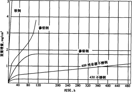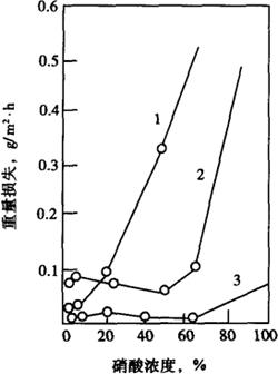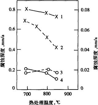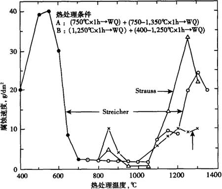 释义 | 1Cr17(AISI430)、1Cr17Ti(AISI437) 这是两种中等铬含量的铁素体不锈钢。当1Cr17钢中含碳量较高而铬含量较低时,此钢的组织结构除铁素体外还有一定量的珠光体或铁素体+碳化物。1Cr17Ti由于低碳并加Ti稳定化元素,此钢的组织结构为纯铁素体。它的耐晶间腐蚀性,成型性和焊接性均优于1Cr17。这二种铁素体不锈钢脆性转变温度均在室温以上,而且都对缺口敏感,所以不适于制作在室温以下承受载荷的设备和部件,通常使用的钢材截面尺寸一般不允许超过4mm。1Cr17,1Cr17Ti在大气、水蒸气等介质中具有不锈性,但当介质中含有较高Cl-时,不锈性则嫌不足。这二种钢在氧化性酸溶液中均有接近0Cr18Ni9(Ti)钢的耐蚀性。由于这两种钢具有耐蚀性、力学性能以及热导率高的特点,它们主要用于生产硝酸、硝铵的化工设备,如吸收塔、热交换器、酸槽输送管道、贮槽等,薄板广泛用于建筑内装修、日用办公设备、厨房器具、汽车装饰、气体燃烧器等。 (1)化学成分 1Cr171Cr17Ti钢的化学成分见表2-8。 表2-8 1Cr17,1Cr17Ti钢的化学成分,% (2)物理性能 1Cr17 1Cr17Ti 密度o:7.72g/cm3 7.7g/cm3 比热容C:460J/kg·K 460J/(kg·K) 线膨胀系数α:20~100℃时,10×10-6/K 10.0×10-6/K 20~200℃时,10.0×10-6/K 10.0×10-6/K 20~400℃时,10.5×10-6/K 10.5×10-6/K 20~500℃时,11.0×10-6/K 11.0×10-6/K 热导率λ:25W/m·K 25W/m·K 比电阻:600nΩ·m 600nΩ·m (3)力学性能 1Cr17,1Cr17Ti钢的力学性能见表2-9。 表2-9 1Cr17,1Cr17Ti钢的室温力学性能 注:①GB1220-92 标准。 ②GB1220-75 标准。 1Cr17(430)高温抗张性能见图2-13。 图2-13 1Cr17和00Cr17Ti高温抗张性能 (厚1.5mm) 1Cr17(430)钢蠕变破断强度见图2-14。 图2-14 中Cr铁素体不锈钢的蠕变破断强度 (4)耐蚀性 a.均匀腐蚀 1Cr17,1Cr17Ti钢在氧化性环境中耐蚀性强。然而在非氧化酸及活化作用的溶液中耐蚀弱,只能作为制造醋酸用设备的耐蚀材料。 1Cr17、1Cr17Ti钢耐均匀腐蚀性能见表2-10,图2-15,图2-16。 表2-10 1Cr17,1Cr17Ti钢耐腐蚀性能 图2-15 1Cr17钢在不同浓度HNO3中的腐蚀率 1-沸腾;2-60℃;3-20℃ 图2-16 不同热处理温度时,1Cr17Ti钢在HNO3中的耐蚀性 1-25%HNO3;2-65%HNO3;3-45%HNO3;4-5%HNO3 1Cr17,1Cr17Ti钢在硫酸溶液中使用,室温时允许使用浓度在0.5%以下,90%以上,66℃以下允许使用的浓度0.1%以下95%以上。在硝酸溶液中,HNO3浓度<20%时可用至沸腾温度,20%~40%,使用温度<70℃,40%~70%,<60℃。 b.耐晶间腐蚀 铁素体不锈钢中C,N溶解度比奥氏体不锈钢小,而由于Cr,C等在铁素体中扩散速度快,容易生成碳化物和氮化物,因此表现出晶间腐蚀特性与奥氏体不锈钢不同。图2-17指出1Cr17钢敏化温度范围在400~600℃附近,在1100℃以上高温区暴露也产生敏化,此敏化的高温区,是冷却途中通过400~600℃时生成碳化物的结果,此碳化物生成极快。在700~850℃温度区稳定化处理,碳化物生成时产生的Cr贫化,由于Cr的再扩散,敏化消失。 1Cr17Ti钢,由于低C加Ti稳定化,可抑制钢的敏感性。 图2-17 热处理温度对Cr17(430)钢晶间腐蚀的影响 1Cr17,1Cr17Ti钢在760~816℃退火处理在硫酸+硫酸铜+铜屑法,65%HNO3法检验均无晶间腐蚀(见表2-11)。 表2-11 1Cr17Ti钢的晶间腐蚀性能 (5)抗氧化性 1Cr17钢(430)的抗氧化性见图2-18。 图2-18 816℃加热后增重的比较 (6)冷热加工性 1Cr17,1Cr17Ti钢开始热加工温度为1050~1150℃,为了获得微细晶粒和较好的塑性,热加工终止温度应<850℃并保证足够的变形量。 退火:热轧带在罩式炉退火,退火温度为825~875℃,>8小时。 冷轧带在连续退火酸洗炉的冷线或混线上处理,处理温度控制在850~860℃。 (7)成型性 1Cr17、0Cr17Ti钢与软钢比较,屈服强度和抗张强度高,延伸率小,其塑性基本与软钢相似。评价1Cr17,0Cr17Ti薄板冷成型性指标,采用塑性应变比(γ值)及加工硬化指数(n值)。这些指标可用来描述材料的深拉伸性、胀形性及扩孔性。伴随着成型还出现皱折(ridging)和纵裂(二次加工性)问题。 a.胀形性 1Cr17钢n值为0.21~0.22,1Cr17Ti钢的n值为0.22~0.23,较1Cr17钢稍大些(见表2-11)。n值和Er值之间关系如图2-19所示,板厚0.6~1.0mm,Er值随n值变化在9.0~12。显然1Cr17钢板有着中等的胀形性。 图2-19 Er值与硬化指数n值的关系 使用阴模直径与直径几乎相同的球底冲头,如选用有效润滑油,1Cr17钢板可以得到与0Cr18Ni9相同的Er值。日本不锈钢公司记载了Er值的资料(见表2-12)。 表2-12 中Cr铁素体不锈钢的成型试验 b.深拉伸性 深拉伸性(CCV值)与塑性应变比(γ值)有密切的关系(见图2-20),γ值愈大,深拉伸愈好(CCV值愈小)。1Cr17,1Cr17Ti钢的γ值n值见表2-11。为获得较大γ值,应采用合理的冶金工艺,保证冷轧薄板有较大织构系数{111}/{11o}比,就能得到较大的γ值和较小的各向异性。 图2-20 1Cr17钢板(0.8mm)γ值与CCV的关系 c.皱折 1Cr17,1Cr17Ti铁素体不锈钢薄板,拉伸加工,深拉伸加工时容易引起皱折(ridging),这种波纹状起伏是沿着延伸方向如图2-21。皱折程度与钢的成分,钢铸造组织,热轧,退火工艺,冷轧工艺有关,受冷轧薄板织构系数{111}/{110}比的影响,皱折不仅损坏制品外观,而且在皱折显着的地方容易引起破损。因此,对冷成型器件,特别是深拉伸制品用的Cr17钢板,应保证材料有较高的 图2-21 1Cr17(430)圆筒容器的皱折(ridging)(厚0.8mm拉伸比1.9) (8)焊接性 1Cr17钢焊接时,焊接热影响区(HAZ)组织发生变化,即875℃以上,一部分组织转变成γ相,随后冷却过程中,这部分γ相转变成马氏体,此条状马氏体在晶界上多呈不连续状(图2-22)。此马氏体相硬度随碳量增加而提高,通常维氏硬度达到250~300,同