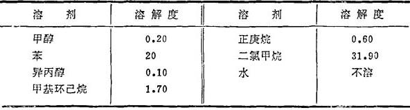 性质 白色结晶粉末。分子量775.2。熔点244℃。溶解度(18℃,克/100克溶剂)如下: