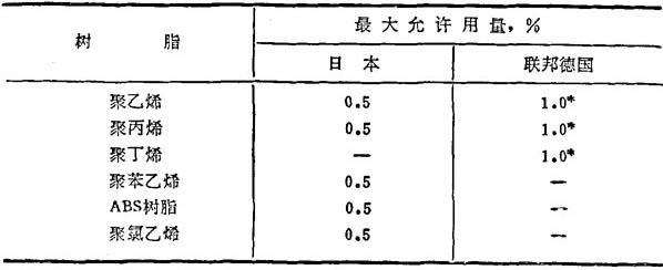 本品可用于接触食品的塑料制品。法国和意大利规定的最大许用量为0.5%;美国食品和药物管理局规定本品用于聚酰胺时的许用量为1%(参见FDA121.2502),用于其它树脂的许用量为0.5%(参见FDA121.2566)。日本和联邦德国的用量限制如表4-9所示。