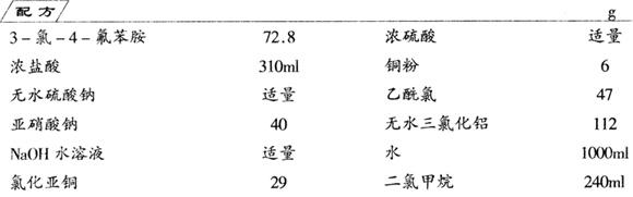 释义 | 2,4-二氯-5-氟苯乙酮 制法 (1)3-氯-4-氟重氮苯的制备 将3-氯-4-氟苯胺72.8g和水500ml加入1000ml的反应瓶中,开始搅拌,缓慢加入浓盐酸180ml,同时加热溶解固体。溶完后以冰盐水冷却至0℃以下,然后滴加亚硝酸钠40g的水溶液,加毕在0~5℃下搅拌反应0.5h,即得重氮盐溶液,直接进行下步反应。 (2)2,4-二氯氟苯的制备 将氯化亚铜29g和浓盐酸130ml加到反应瓶中,搅拌溶解后再加入铜粉6g,加热到40℃,开始滴加上步反应制得的重氮盐溶液,滴1h,滴完后继续升温至80℃反应约0.5h,水蒸气蒸馏出得粗品溶液。静置,分出粗品,依次用NaOH溶液、浓硫酸、水洗至中性。用无水硫酸钠干燥,先蒸馏除去低沸点的化合物,再收集170~175℃馏分,即为2,4-二氯氟苯。 (3)2,4-二氯-5-氟苯酮的制备 将66g 2,4-二氯氟苯和无水三氯化铝112g投入500ml反应瓶中,开始搅拌,滴入乙酰氯47g,控制滴加速度,使温度不超过40℃,加完后继续保持此温度反应1h,加热到120~125℃反应2h。反应完后,置于碎冰中,静置冷却,分出油层后,水层用CH2Cl2提取3次(每次用80ml二氯甲烷),合并有机层,用水洗至中性,再用无水硫酸钠干燥24h。常压蒸出溶剂,减压收集72~78℃0.32kPa的馏分,冷冻结晶,烘干得白色结晶产品。收率82.4%,3步反应总收率70.9%。是生产喹诺酮酸类新型抗菌剂环丙沙星的原料。 |