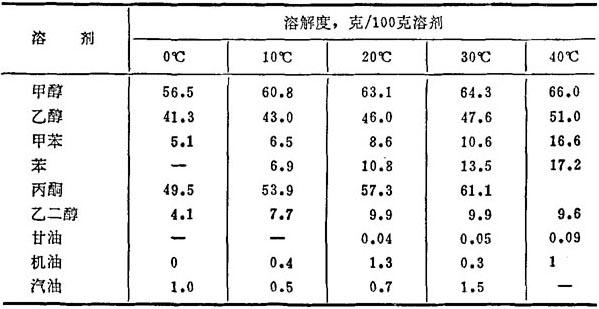 性质 白色粉末。分子量382.6。灰分<0.3%。相对密度1.03~1.09(25℃)。熔点208~212℃。加热减量(70℃,2小时)<0.5%。细度100目全通。溶于丙酮、乙醇、乙醚等有机溶剂,不溶于水。表4-7为其溶解度。