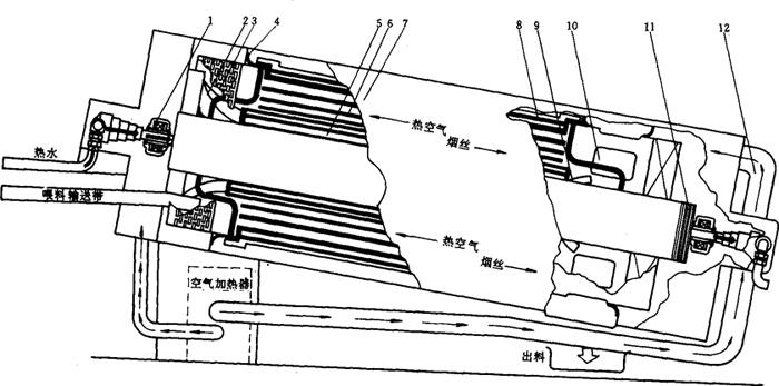 释义 | ATC型环形烘丝机 1.结构特点 (1)ATC烘丝机的筒体是环形结构,外筒用辐条支撑内筒。外筒内表面与内筒外表面均安装有半圆管及由管构成的翻板,该管路系统由高压热水加热;热空气在内、外圆筒之间与烟丝逆向流动。其结构见图9-2-22所示。 图9-2-22 ATC环形烘丝机结构示意图 1-支撑轴承 2-送丝翻板 3-蒸汽清洗的筒形筛 4-柔性密封垫 5-内筒 6-外筒 7-固定壳体 8-矿物毡保温套 9-卸料翻板 10-出料口 11-圆筒传动皮带轮 12-热风管道 (2)ATC烘丝机的整体外形结构见图9-2-23所示。 图9-2-23 ATC烘丝机外形结构示意图 1-皮带秤 2-超级回潮筒 3-环形烘丝机 4-螺旋冷却塔 2A-送丝振槽 3A-加热与冷却装置 3B-除尘系统 4A-红外线水分仪 V1-振动输送机 V2-振动输送机 V3-振动输送机 PCP-烘丝过程控制台 MCP-电机控制台 (3)当烘后烟丝含水率有较小变化时,红外线水分仪均可发出反馈信号给予控制和补偿。温度传感器可监控烘后烟丝高压热水,热空气及蒸汽的温度。在空气加热装置中设有微机控制的分流阀,以调节热风温度;通过圆筒的热风量可以调节。变更热水、回水与冷水的比例而调节水温,以控制圆筒壁面温度。该设备可手动操作,也可自动操作。 2.主要技术参数 (1)生产能力:见表9-2-21所示。 表9-2-21ATC烘丝机生产能力 (2)当生产能力为13500kg/h时,从烟丝中排除的水分量最大为1400kg/h。 (3)烟丝在烘丝机内时间:3min。 (4)烘后烟丝含水率控制偏差为±0.5%(标准偏差0.25%)。 (5)经过烘丝与冷却系统,烟丝填充值可增加15%。 (6)烟丝烘后温度65~70℃,冷却后温度控制范围为±1.0℃(标准偏差为0.5%)。 (7)动力消耗: 圆筒传动装机功率: 7.5kW; 预热风机装机功率: 3.0kW; 循环水泵装机功率: 15.0kW; 要求蒸汽压力: 1.38MPa; 供给压缩空气压力: 0.28MPa。 3.生产厂家 英国AMF莱格(AMF LEGG)公司。 |