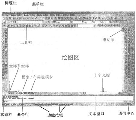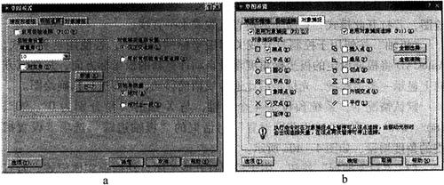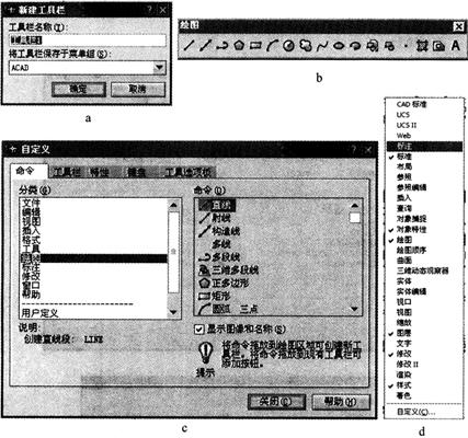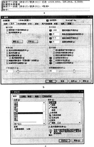 释义 | AutoCAD用户界面及操作 (一)AutoCAD2005界面操作 AutoCAD软件的最新版本为AutoCAD2005,其工作界面如图4-36所示,通常由五块组成,最上方为标题栏和菜单栏,最下方为命令提示行及状态栏,左侧及菜单栏下方为工具栏,右侧为能控制绘图区移动的滚动条,中间大块空间为绘图区,并带有坐标系、光标及模型/布局等。 图4-36 AutoCAD2005界面 1.绘图区操作 绘图区是用户绘图的工作区域,其左下方有一个表示坐标系的图标,图标中“W”字母表明AutoCAD当前正在使用的是世界坐标系,而“X”、“Y”分别指示X轴和Y轴的正方向。 当移动鼠标时,绘图区域中的十字形光标会跟随移动,同时状态栏中将显示出光标点的坐标读数,且以“X”、“Y”形式显示。若以极坐标形式(距离、角度)显示坐标读数,则可连续按F6键予以实现。 绘图区包含模型空间和图纸空间两种绘图环境,由绘图区底部的三个选项卡“模型”、“布局1”、“布局2”控制,在默认设置下“模型”选项卡是按下的,表明当前绘图环境是模型空间,用户在这里一般按实际尺寸绘制二维或三维图形。若单击选项卡“布局1”或“布局2”即可切换到图纸空间,在模拟图纸上将模型空间的图样按不同缩放比例布置在图纸上。 2.标题栏与菜单栏操作 如传统Windows软件一样,标题栏就是主窗口最上边的深蓝色条,其上显示了相应的应用程序名称,左端是控制菜单图标,用鼠标单击该图标或按Alt+空格键,将弹出窗口控制菜单,可用该菜单完成最大化、还原、移动和关闭窗口等操作。 菜单栏右端是“最小化”、“最大化”和“关闭”三个按钮。若当前程序窗口未处于最大化或最小化状态,则将光标移至标题栏后,按下鼠标左键并拖动,可任意移动程序窗口的位置。 菜单栏通常位于标题栏之下,其中显示了可以使用的菜单命令。单击菜单栏时会弹出对应的下拉菜单,下拉菜单包含了AutoCAD的核心命令和功能,用鼠标选择菜单中的某个选项时,AutoCAD便可执行相应命令。 若选择菜单中带有三角形标记“△”项时,将弹出新菜单供用户作进一步选择用;若选择菜单中带有省略号标记“…”项时,AutoCAD将打开一个对话框,通过此对话框用户可进一步操作。 若使用快捷键则不必打开下拉菜单,便可通过按该组合键完成某项功能,如使用Ctrl+O键打开图形文件,相当于选择“文件”菜单中的“打开”命令。 AutoCAD2005还提供了一种快捷菜单,当试着在不同的地方右击时,将弹出不同的快捷菜单,且快捷菜单的选项也因单击环境的不同而变化,快捷菜单提供了快速执行命令的方法。 3.工具栏操作 执行AutoCAD命令除了可以使用菜单外,还可以通过工具栏执行,工具栏提供了调用AutoCAD命令的快捷方式,包含许多命令按钮和20多个工具栏,用户可根据需要打开、关闭或移动某个工具栏,还可单击“新建”按钮,弹出“新建工具栏”对话框(图4-37a)。 图4-37 工具栏操作 a.“新建工具栏”对话框 b.“绘图”工具栏 c.“自定义”工具栏 d.光标菜单 通常,启动AutoCAD工具栏后,主窗口中仅显示“标准”工具栏、“对象特性”工具栏、“修改”及“绘图”工具栏(图4-37b),其中前两个工具栏放在绘图区的上边,后两个工具栏放在绘图区左边。 AutoCAD2005采用浮动的方式放置,可放置在窗口的任意位置,以便根据需要移动光标箭头于工具栏边缘,按下鼠标左键并移动,将工具栏随光标移动到窗口的其他位置。 AutoCAD2005也可通过自定义工具栏的方式改变工具栏中的内容(图4-37c),或通过选择“工具”/“自定义”命令隐藏或显示某些工具栏,还可以在打开或关闭工具栏时,移动光标到任意一个工具栏上,单击鼠标右键便弹出光标菜单(图4-37d),列出所有工具栏的名称,若名称前带有“√”标记,则表示该工具栏已打开,选择菜单上某一选项,打开或关闭相应的工具栏。 4.命令提示行操作 命令行是通过键盘输入命令、数据等显示的地方,用户通过菜单和工具栏执行的命令,也将在命令行中显示命令的执行过程,按F2键打开命令窗口,如图4-38a所示,此窗口中将显示更多的历史命令,若再次按F2键便可关闭窗口。在默认设置下,仅显示3条命令,但可在“选项”对话框的“显示”选项卡中设置命令提示行的行数,并单击“工具”/“选项”命令即可打开“选项”对话框(图4-38b)。 图4-38 命令行操作 a.命令提示行窗口 b.“选项”对话框 c.“命令”选项卡 命令提示行中显示的文字是AutoCAD与用户进行交流的信息,记录了AutoCAD与用户交流的过程,可通过命令提示行右边的滚动条阅读。单击“命令”按钮,对话框将切换到“命令”选项卡,在左侧的“分类”列表中选择“绘图”,则右侧的“命令”列表中将显示“绘图”工具栏中可以放置的全部命令,如图4-38c所示。 每个图形文件都有自己的命令行,默认状态下,命令行位于系统窗口的下面,也可以将光标移动到命令窗口的标题栏,再按住鼠标左键并拖动,将命令行布置在屏幕其他位置。 5.状态栏操作 绘图过程中的许多信息将在状态栏中显示出来,如其左部显示了当前十字形光标的位置及一些提示文字等,右部还含有绘图时显示和控制的“捕捉”、“栅格”、“正交”、“极轴”等8个功能按钮,其作用与操作如下。 (1)“捕捉”和“栅格”按钮:如图4-39所示,单击“捕捉”按钮可控制是否使用捕捉功能。当打开捕捉模式时,光标只能沿X轴、Y轴或极轴方向精确移动,且每次位移的距离
