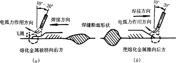 释义 | CO2保护焊工艺参数选择 1.电源极性的选择 表5-47 CO2保护焊工艺参数选择 2.焊接电流和电弧电压的选择 CO2焊、焊接电流、电弧电压选择适当,很好配合,才能获得所需要的熔滴过渡形式、稳定的工艺过程和希望的焊缝性能。若焊接电流和电弧电压配合不当,电弧电压过低会造成焊丝插入熔池短路而中断焊接过程。若电弧电压过高则破坏短路过渡或潜弧过渡形式,转为明弧滴状过渡,使飞溅增大、焊接过程不稳。 (1)不同焊丝直径CO2焊常用焊接电流和电弧电压范围见表5-48。 表5-48 不同焊丝直径CO2焊对应的焊接电流和电弧电压 (2)焊接电流与电弧电压对焊缝成形的影响:焊接电流与电弧电压对焊缝熔深H、熔宽B和余高a的影响见图5-26及图5-27。 图5-26 焊接电流对焊缝形状的影响 1-焊缝厚度 2-熔深 3-焊缝宽度 (焊丝直径1.6mm、CO2流量20L/min、电弧电压38V、焊接速度70cm/min) 图5-27 电弧电压对焊缝形状的影响 1-焊缝厚度 2-熔深 3-焊缝宽度 (焊丝直径1.6mm、焊接电流450A、焊接速度70cm/miin、CO2流量20L/min) (3)焊接电流、电弧电压对气孔的影响:图5-28是实芯钢焊丝时的实验结果。 图5-28 焊接电流、电弧电压对气孔的影响 (4)焊接电流对熔滴过渡频率的影响:随焊接电流增加,熔滴过渡频率提高,见图5-29。 图5-29 焊接电流对熔滴过渡频率的影响 (5)电弧电压对短路频率的影响:在17~22V短路过渡区,短路频率最高,数千次至百余次。到27~35V粒状过渡区短路几率很小,其短路过渡频率只有几次。如图5-30所示。 图5-30 电弧电压对短路频率的影响 (a)短路过渡 (b)中间区域 (c)颗粒状过渡 3.短路电流增长率的选择 表5-49是不同直径焊丝所需的短路电流增长率范围。在焊丝直径和其他参数一定时,短路电流增长率有一最佳范围。若短路电流增长率过大,使峰值短路电流过大,会产生大量小颗粒飞溅,若短路电流上升率过小,使峰值短路电流过小,则产生大颗粒飞溅。峰值短路电流一般为焊接电流的2~3倍为好。短路电流上升率及峰值短路电流数值是靠改变焊机主回路电感量调节的。调节主回路电感量就改变了短路电流增长率。主回路电感量调节范围一般为0~0.2mH。细丝需要电感量小,粗丝需要电感量大。 表5-49 不同焊丝直径要求的短路电流上升率(钢焊丝CO2保护焊) 4.焊接速度选择 焊接速度对焊缝截面形状的影响如图5-31所示。焊接速度增大,焊缝宽度B、熔深H、余高a均减小。速度过大会引起焊缝两侧咬肉。焊接速度减小则B、H、a均增大,速度太慢则造成烧穿和组织粗大等缺陷。 图5-31 焊接速度对焊缝断面形状的影响 1-焊缝厚度 2-熔深 3-焊缝宽度 (条件:焊丝直径1.6mm、焊接电流450A、电弧电压38V、CO2流量20L/min) 5.焊丝直径的选择 不同直径的焊丝适用范围见表5-50。焊丝直径增大时,焊缝熔深增大,溶化速度减小,转变成颗粒过渡的电流临界值增大。 表5-50 不同直径CO2焊焊丝适应范围 6.焊丝伸出长度l的影响 CO2焊接时,焊丝伸出长度l增加,焊丝上电阻热增加,熔化速度增加快、生产率提高。过大时发生焊丝过热,使焊丝成段熔断、造成飞溅破坏过程的稳定性,并使气体保护效果下降。伸出长度过小喷嘴易堵塞,同样会破坏过程稳定和降低气体保护效果。一般碳钢焊丝伸出长度应为焊丝直径的10~12倍。不锈钢焊丝由于电阻率较大,伸出长度可略短些。 7.CO2气体流量的选择 CO2气体流量与焊丝直径、喷嘴内径、焊接电流、焊接速度、环境风速有关,随着上述参数的增大,CO2流量应相应增加。一般细丝CO2焊,CO2流量为10~15L/min,粗丝CO2焊为15~25L/min,粗丝大电流CO2焊为25~50L/min。 8.焊枪倾斜角选择 焊枪在施焊时的倾斜角对焊缝成形有一定影响。图5-32是平焊时焊枪倾斜角对焊缝成形的影响。 图5-32 平焊时焊枪倾斜角对焊缝成形的影响 |