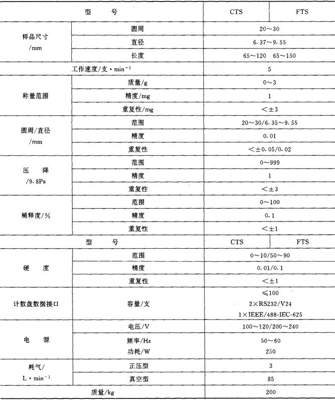 释义 | CTS/FTS烟支/滤棒综合测试仪 1.结构特点 CTS系列烟支综合测试仪及FTS系列滤棒综合测试仪应用同一种仪器可连续测量烟支和滤棒的质量、圆周/直径、压降/稀释度、硬度。仪器操作简单,在中央处理单元的控制下,自动完成各种参数的测量、打印,同时也可通过键盘输入不同的指令,选择不同的测量参数。各测量单元的校准是在中央处理单元及显示器指示下进行各种操作,仪器还具有自诊断和故障报警功能。 CTS、FTS两种系列综合测试仪由各测量单元组成,各测量单元由气路、模拟电路、机械传动及集中控制的中央处理单元组成。气路部分提供综合测试仪各测量单元所需的气源,保证测量过程中各测量单元所需17.5mL/s的恒定标准流量,各单元都配置有气体真空泵及相应的流量控制单元。辅助设备Mark11空气过滤器,对专用压缩机提供的10.5MPa压力进行调整、净化并保证仪器供气量为4Pa的正常工作压力;模拟电路部分为中央处理单元或执行单元提供信号输入;机械传动部分主要完成被测样品的贮存、传送、收集、与光电信号配合、执行测量过程中所需的各种机械协调动作;中央处理单元是测量系统的中枢,对各测量单元进行协调控制,完成信息处理、计算、显示、打印、自诊断、校准等。 质量测量通过力补偿线圈或负荷传感器来完成。 圆周/直径测量应用线位移原理完成。 CTS系列产品采用真空法,既可测量压降也可测量稀释度。 硬度测量通过测量位移量实现。 CTS、FTS系列型号及功能见表9-10-2。 表9-10-2 CTS、FTS系列型号及功能 2.主要技术参数 CTS、FTS综合测试仪的技术参数见表9-10-3。 表9-10-3 CTS、FTS综合测试仪技术参数 3.外形尺寸 主机尺寸:长×宽×高为630mm×600mm×1650mm。 4.生产厂家 英国Filtrona公司。 |
