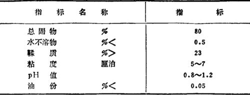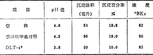 取杨梅栲胶60%、落叶松栲胶20%、柚柑栲胶15%、橡椀栲胶5%,混合溶化后,按栲胶量加入1.8%亚硫酸钠处理,然后加入DLT-4号,加入量以pH值至3.7~3.8为准。静置48小时测得如下数据。