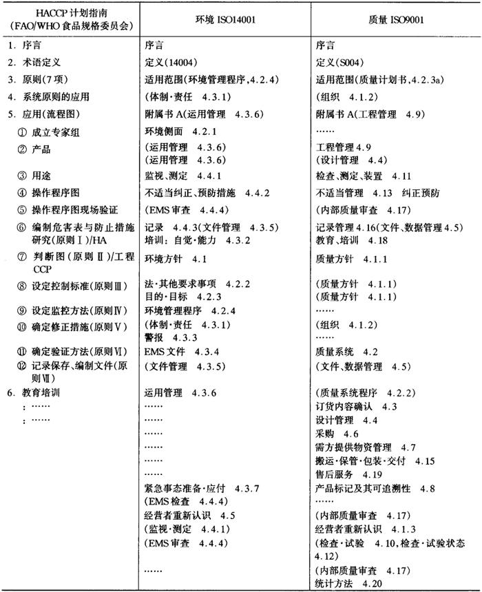 | 释义 | ISO9000与HACCP的互补性 质量管理和质量保证的国际标准ISO9000制定以来,作为产品满足质量要求、给用户以信赖感,维护消费者的标准已成为世界各国审查登记制度的基本标准。在保护消费者形势日益高涨的今天,这一制度有望为所有行业采纳,并迅速在世界范围内推广。 另一方面,HACCP作为产品安全性、健全性和正常性管理的有效方法,其重要性已得到国际认可,众多食品企业正在推行这一管理方式。1996年10月,美国不杀菌苹果汁发生病原大肠菌O157菌中毒事件,为此FDA指定果汁加工厂实行HACCP计划管理。美国可口可乐公司也制定了饮料工业HACCP。HACCP作为原来生产过程中产品的安全性管理,预测对人体产生显着不良影响的项目(如不加控制就不能保证食品安全的不可缺少的必须管理环节),确定允许极限进行监控。如果将对象项目扩大至安全性以外的项目,或者一般卫生管理事项不齐备,使管理焦点模糊,结果将会降低其有效性。实际上,食品制造厂发生的问题不仅与安全性有关,还有与食品“味”等有关的嗜好性问题和产品出厂等规章制度问题,从发生的问题数量看,这些问题或许比安全性更应值得重视,因此食品生产厂必须将食品安全性,同时包括工作质量作为当然的质量项目进行管理和保证。 要将各项质量管理项目作为企业整体的计划进行质量保证管理,不能说HACCP系统在这方面是充分的,为此必须将HACCP计划和ISO9000标准结合起来,建立综合质量保证管理体系,将食品安全性保证和质量保证作为食品制造的头等大事来抓。HACCP和ISO对照见表7-2-3。 表7-2-3HACCP与ISO对照表