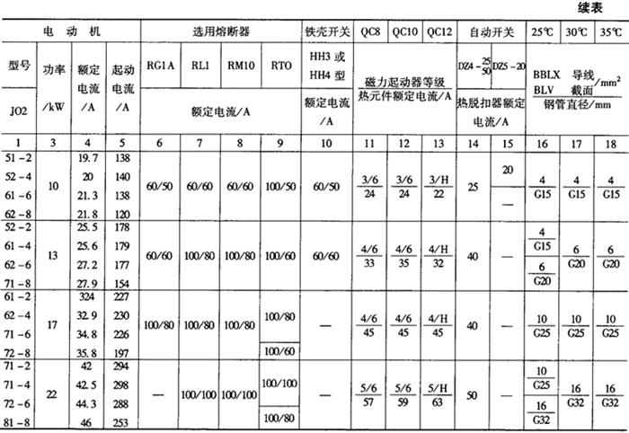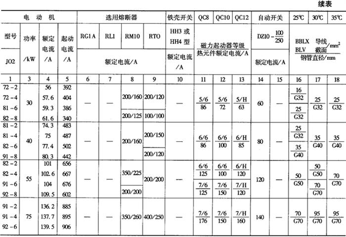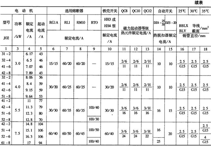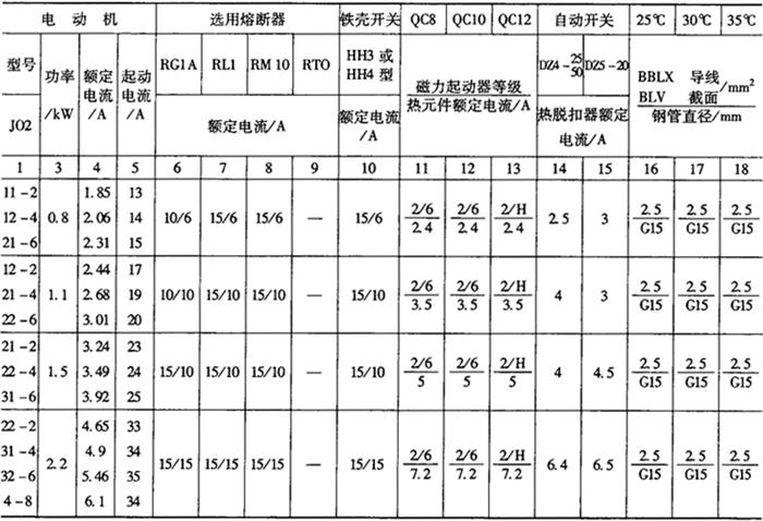 JO2系列电动机起动保护设备及导线选择可参照表3-4。其功率从0.8kW到75kW。表3-1 JO2系列电动机起动保护设备及导线选择